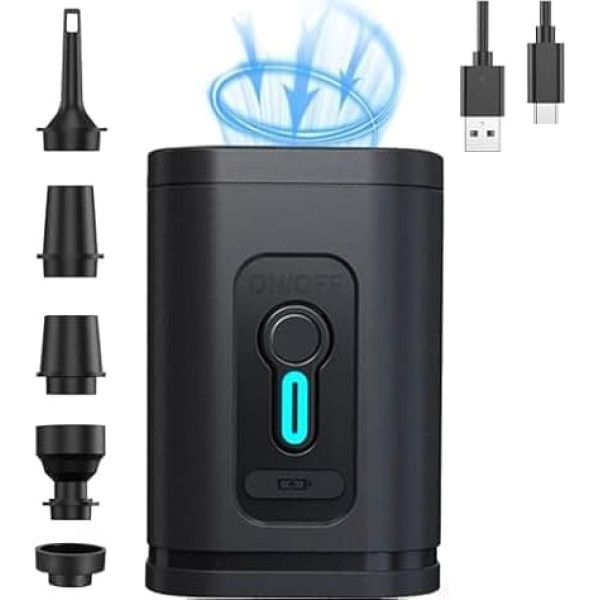 Mini air pump electric inflator: rechargeable and wireless: with a USB port, this USB mattress pump can be quickly charged via a power adapter, a laptop, a USB charger in the car or a power bank. The wireless design puts an end to tangled cables and allows you to use it wirelessly anytime and anywhere without being restricted by the power supply Portable air pump for mattress: durable energy and charging indicator: with the built-in 4000 mAh lithium battery, the quick fill battery air pump can support a long operating time of up to 30-40 minutes. There are also 4 charging indicators, perfect for checking the remaining power and charging status Air pump electric air mattress pump: compact and lightweight and portable: our portable air pumps with a weight of only 135 g, is about as large as a palm, which is ultra-light and compact to save space and carry, so that inflation pump easy to hold, and offer convenience in indoor and outdoor occasions. You can easily pack USB pumps in the storage bag and hang wireless air pump on your backpack or it fits well in your carried package and travel suitcase Air pump for air mattress: quick inflation and labor saving: this portable inflatable deflate pump is equipped with a small but powerful motor that is able to maximise the air flow for quick and effortless inflation. Since wireless air mattress pumps are battery operated, you do not need to inflate it by hand Electric air pump for inflatable: wide application: the universal electric inflatable pump can not only inflate objects, but also deflate. The inflation air pump is equipped with 3 different nozzle sizes and is suitable for inflating a variety of inflatable products, such as inflatable sleeping bags, swimming rings, inflatable pools, floats, toys, boats, loungers, sofas, yoga balls, cushions and other compatible accessories › See more product details
