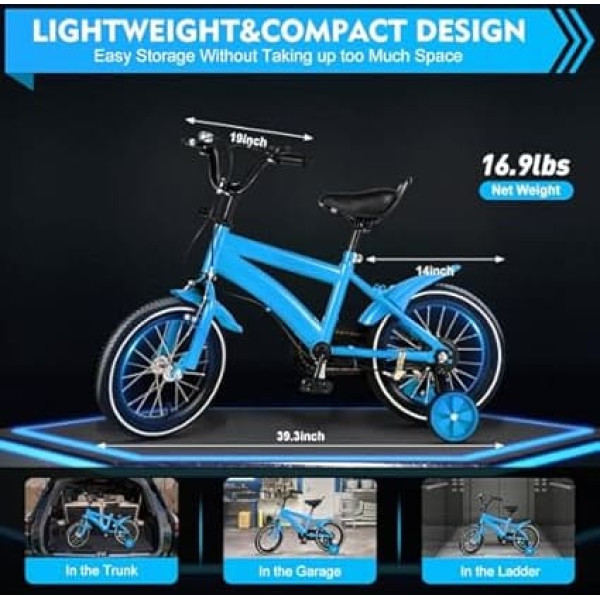 High quality: the 14 inch children's bike is made of high-quality carbon steel wheels, PC pedals, rubber handles and tyres for excellent stability and cushioned rubber tyres that adapt well to different road surfaces; this children's bike is a perfect gift for children. Adjustable: 14. The seat height of the inch children's bike is from 22-26.3 inches and the armrests are adjustable from 27-30.3 inches, so that the height can be adjusted to the growth of your child and promote a correct riding position. Safe driving: the 14 inch rubber tires of the children's bike and two additional wheels form a stable triangular structure that keeps balance and prevents falls; reliable double brakes ensure strong braking force, and the enlarged PC pedals have a larger contact surface for more driving safety. HIGH PERFORMANCE: The PU seats of the children's bike increase riding comfort and offer your child a pleasant ride, the brakes of the children's bike are very reliable and equipped with a chain cover so that the chain does not hurt your child's feet. › See more product details; Product description 14 inch children's bicycle with stabilisers. Specifications: Material: carbon steel, PC, PU, sponge, rubber. Colour: yellow/blue/red/white, black. Assembly requirements: yes. Mounting Type: Freestanding Wheel diameter: 35.56 cm/14 inches. Height of seat adjustment: 55.88-66.8 cm/22-26.3 inches. Adjustable armrest: 68.58-77 cm/27-30.3 inches. Suitable children's height: 100-115 cm/39.37-45.28 inches. Length of armrest: 48.26 cm/19 inches. Product length: 100 cm. Package size: 81.3 x 43 x 18 cm/32.01 x 16.93 x 7.09 inches. Gross weight: 8.9 kg/19.62 lbs. Net weight: 7.67 kg/16.9 lbs. Package includes: 1 x 14 inch children's bicycle. Other accessories for assembly. Application: It is suitable for children with a height of 39.37-45.28 inches. It can be used for entertainment or exercise. Details Seat Handle: It is very convenient and easy for parents to control the direction of the bike and protect the children at all times. RUBBER TIRE:It provides a stable riding experience on various road surfaces and meets more driving needs. Notes: 1. Please check the style and size before purchasing. 2. Please wear protective equipment during use and do not use it on public transport. 3. Please do not let your child drive alone. We recommend that you accompany your child while driving. 4. Please allow for slight colour differences due to the shooting light and 1-3 cm error due to manual measurement and make sure you do not mind this before ordering.; Product description 14 inch children's bicycle with stabilisers. Specifications: Material: carbon steel, PC, PU, sponge, rubber. Colour: yellow/blue/red/white, black. Assembly requirements: yes. Mounting Type: Freestanding Wheel diameter: 35.56 cm/14 inches. Height of seat adjustment: 55.88-66.8 cm/22-26.3 inches. Adjustable armrest: 68.58-77 cm/27-30.3 inches. Suitable children's height: 100-115 cm/39.37-45.28 inches. Length of armrest: 48.26 cm/19 inches. Product length: 100 cm. Package size: 81.3 x 43 x 18 cm/32.01 x 16.93 x 7.09 inches. Gross weight: 8.9 kg/19.62 lbs. Net weight: 7.67 kg/16.9 lbs. Package includes: 1 x 14 inch children's bicycle. Other accessories for assembly. Application: It is suitable for children with a height of 39.37-45.28 inches. It can be used for entertainment or exercise. Details Seat Handle: It is very convenient and easy for parents to control the direction of the bike and protect the children at all times. RUBBER TIRE:It provides a stable riding experience on various road surfaces and meets more driving needs. Notes: 1. Please check the style and size before purchasing. 2. Please wear protective equipment during use and do not use it on public transport. 3. Please do not let your child drive alone. We recommend that you accompany your child while driving. 4. Please allow for slight colour differences due to the shooting light and 1-3 cm error due to manual measurement and make sure you do not mind this before ordering.; 14 inch children's bicycle with stabilisers. Specifications: Material: carbon steel, PC, PU, sponge, rubber. Colour: yellow/blue/red/white, black. Assembly requirements: yes. Mounting Type: Freestanding Wheel diameter: 35.56 cm/14 inches. Height of seat adjustment: 55.88-66.8 cm/22-26.3 inches. Adjustable armrest: 68.58-77 cm/27-30.3 inches. Suitable children's height: 100-115 cm/39.37-45.28 inches. Length of armrest: 48.26 cm/19 inches. Product length: 100 cm. Package size: 81.3 x 43 x 18 cm/32.01 x 16.93 x 7.09 inches. Gross weight: 8.9 kg/19.62 lbs. Net weight: 7.67 kg/16.9 lbs. Package includes: 1 x 14 inch children's bicycle. Other accessories for assembly. Application: It is suitable for children with a height of 39.37-45.28 inches. It can be used for entertainment or exercise. Details Seat Handle: It is very convenient and easy for parents to control the direction of the bike and protect the children at all times. RUBBER TIRE:It provides a stable riding experience on various road surfaces and meets more driving needs. Notes: 1. Please check the style and size before purchasing. 2. Please wear protective equipment during use and do not use it on public transport. 3. Please do not let your child drive alone. We recommend that you accompany your child while driving. 4. Please allow for slight colour differences due to the shooting light and 1-3 cm error due to manual measurement and make sure you do not mind this before ordering.