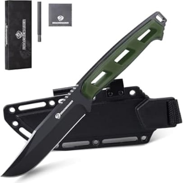 DRACHENADER Hunting Knife Fixed Blade, Belt Knife 10 cm Blade Length, 5Cr13MoV Steel, Outdoor Knife with Fire Steel and ABS Sheath, Black Blade + Green Handle