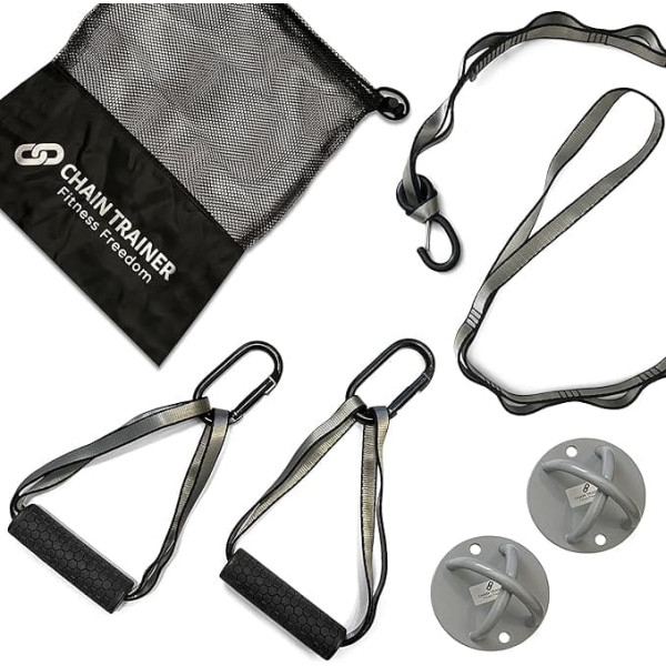 HIGH QUALITY MATERIALS The system features high quality materials, including a 22kn webbing and 22kn carabiner. No breakage: each accessory has a minimum thickness of 3 kn per side. One Kn pfen corresponds to a break strength of 230 pounds. PERFECT FITNESS SOLUTION: on-the-go training tailored to each muscle group; hang it on a door, overhead bar, or even a tree. Want to set up your home gym? Chain Trainer offers the most robust ceiling mount in the business. Easy to Use Place the door anchor on top of the door frame and close it securely. Enjoy your workout! QUICK WORKOUTS: Quickly adjustable carabiners and our patent pending daisy webbing make quick adjustments easy and minimize downtime between exercises. Chain Trainer: Advanced includes: 2 nylon chain straps, 2 ergonomic handles with carabiners, 2 ceiling anchors, 1 door anchor, 1 mesh drawstring travel bag › See more product details