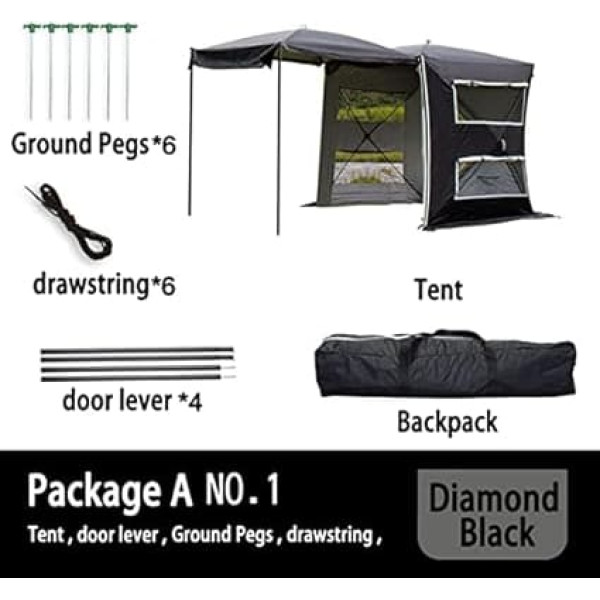HIGH QUALITY MATERIAL: This car rear tent is made of 420D encrypted Oxford fabric and is finished with silver coating, which is effectively waterproof and UV resistant. The removable bottom fabric attached to the pool effectively prevents snakes and insects from entering. EXPANDABLE SPACE: It can be connected to the vehicle by picking up the rear apron to expand double the space, and the umbrella design enlarges the actual interior space and can accommodate 3-4 people. Floor cloth and rain cover can be removed. With four ventilation windows, ventilation and air. Lightweight and portable: the tent is very light, can be opened quickly and easy to assemble. Whether you are hosting an outdoor family party or a hiking picnic, you can use our tent for various outdoor sports. Small and portable, does not take up space, easy to carry out large outdoor trips. Easy to assemble: simply pull our tent over your tailgate and attach it. You don't have to keep track of numerous parts. Don't spend another minute setting up the poles on a dark campsite! This simple setup is possible alone or with a partner. Multiple functions: the car tent site can be used for a variety of outdoor scenes as an extended car space for self-driving, outdoor camping, shade, picnics, fishing, outdoor adventures, etc. › See more product details; Product description Car Trunk Tent Free Built Quick Open Mosquito Proof Double Layer Waterproof Sunshade Tent Large Space for Camping Self Propelled Description: Material: Outer Tent - 450D PU200OMM W/R UV50+; Inner Mesh Layer - 20D Anti Hook Yarn; Bottom Tent - Double Sided PE PU3500 Weight: 11 kg. Extended size: 180 x 180 x 210 cm. Bearing size: 130 x 20 x 20 cm. Package size: 130 x 27 x 27 cm. Product list: 1 x boot tent; Product description Car Trunk Tent Free Built Quick Open Mosquito Proof Double Layer Waterproof Sunshade Tent Large Space for Camping Self Propelled Description: Material: Outer Tent - 450D PU200OMM W/R UV50+; Inner Mesh Layer - 20D Anti Hook Yarn; Bottom Tent - Double Sided PE PU3500 Weight: 11 kg. Extended size: 180 x 180 x 210 cm. Bearing size: 130 x 20 x 20 cm. Package size: 130 x 27 x 27 cm. Product list: 1 x boot tent; Car Trunk Tent Free Built Quick Open Mosquito Proof Double Layer Waterproof Sunshade Tent Large Space for Camping Self Propelled Description: Material: Outer Tent - 450D PU200OMM W/R UV50+; Inner Mesh Layer - 20D Anti Hook Yarn; Bottom Tent - Double Sided PE PU3500 Weight: 11 kg. Extended size: 180 x 180 x 210 cm. Bearing size: 130 x 20 x 20 cm. Package size: 130 x 27 x 27 cm. Product list: 1 x boot tent