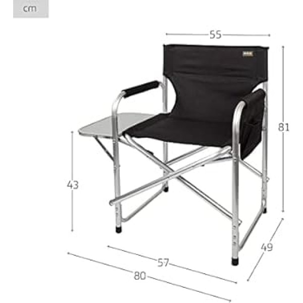 Aktive Folding camping chair with dimensions 57 x 48 x 81 cm Comfortable: with seat and backrest made of 600D Oxford fabric in black and armrests with padding Robust: frame made of aluminium and non-slip nubs, can hold up to 110 kg Extra: with removable table on the side and inside and outside pockets with Velcro closure on the other side EASY TO CARRY Folds in one motion for convenient transportation anywhere › See more product details