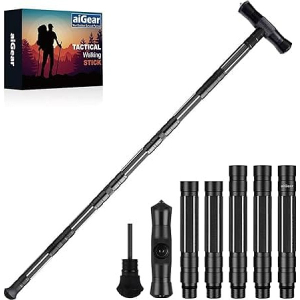 Satisfy your thirst for adventure: you will feel 100% satisfaction once you receive the trekking poles. They come with a carry bag and a complete set of accessories (including 5 x sections and 1 x handle, 1 x anti-skid, 1 x magnesium rod), which are suitable for trekking, hiking, Nordic walking and backpacking, etc. Premium CNC Machined Construction: Our tactical walking stick is made of high quality 6061-T6 aluminum alloy, crucial for hiking or backpacking in rough terrain and supporting heavier weights. Perfect as all-day hiking poles. VERSATILE HANDLE The handle of this hiking pole can be configured as a straight handle or T-handle, providing ergonomic comfort and versatility. The total length of the hiking poles reaches up to 43.5 inches. When not in use, they can be easily folded and stored in your backpack. We give storage bags as a gift. Increase your footprint! : Whether you're navigating rugged landscapes or well-trodden trails, aiGear hiking poles are characterised by outstanding features that help you walk comfortably with these hiking poles. Perfect as an all-day hiking pole are suitable for women, men, seniors. Meet your preferences when hiking and hiking. Compatible and adjustable: our hiking poles are available in different colour specifications and interchangeable accessories. If necessary, you will find replacement accessories for the walking stick on aiGear. The product comes with a demo video for easy assembly, so you are ready to use in no time. › See more product details