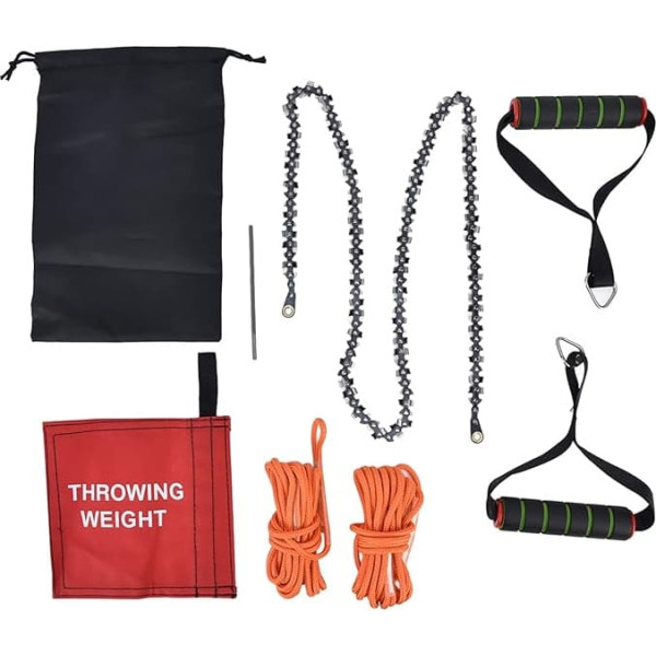 50% MORE BLADES: The High Limb Rope Chain Saw has an improved 48 inch chain with double-sided teeth on both sides - 62 sharpest carbon steel teeth. Domed double layer riveted links give strength to the link chain and stabilise the bend, reducing breakage and bonding Blades on both sides: no matter how it lands, cut high limbs safely and easily from the ground Premium Material: The high reach hand chainsaw is made of high quality manganese steel, which is strong and durable. Easy to use: the chain is installed and attached to the handle and can be used. The flexible chain is suitable for branches of any height. Scope of application: this high range chainsaw is suitable for outdoor camping, wild survival, hunting, backpacking and gardening. › See more product details; Product description Function: This portable survival saw is 48 inches long and can cut wood from small branches to medium trunks in minutes. The high reach hand chainsaw is made of high-quality manganese steel, which is strong and durable. The chain is mounted on the handle and fixed and can be used. The flexible chain is suitable for any height of branches. This high range chainsaw is suitable for outdoor camping, wild survival, hunting, backpacking and gardening. The compact folding hand saw safely and easily cuts high branches from the ground when ladders are out of reach. Specifications: Item Type:High Reach Chainsaw Material: 65 manganese steel Chain size: 48 inches Gross weight: approx. 605 g / 21.3 ounces. Scope of application: outdoor camping, tree pruning Package list: 1 x chain, 2 x rope. 2 x handles. 1 x file. 1 x red storage bag. 1 x black storage bag.; Product description Function: This portable survival saw is 48 inches long and can cut wood from small branches to medium trunks in minutes. The high reach hand chainsaw is made of high-quality manganese steel, which is strong and durable. The chain is mounted on the handle and fixed and can be used. The flexible chain is suitable for any height of branches. This high range chainsaw is suitable for outdoor camping, wild survival, hunting, backpacking and gardening. The compact folding hand saw safely and easily cuts high branches from the ground when ladders are out of reach. Specifications: Item Type:High Reach Chainsaw Material: 65 manganese steel Chain size: 48 inches Gross weight: approx. 605 g / 21.3 ounces. Scope of application: outdoor camping, tree pruning Package list: 1 x chain, 2 x rope. 2 x handles. 1 x file. 1 x red storage bag. 1 x black storage bag.; Function: This portable survival saw is 48 inches long and can cut wood from small branches to medium trunks in minutes. The high reach hand chainsaw is made of high-quality manganese steel, which is strong and durable. The chain is mounted on the handle and fixed and can be used. The flexible chain is suitable for any height of branches. This high range chainsaw is suitable for outdoor camping, wild survival, hunting, backpacking and gardening. The compact folding hand saw safely and easily cuts high branches from the ground when ladders are out of reach. Specifications: Item Type:High Reach Chainsaw Material: 65 manganese steel Chain size: 48 inches Gross weight: approx. 605 g / 21.3 ounces. Scope of application: outdoor camping, tree pruning Package list: 1 x chain, 2 x rope. 2 x handles. 1 x file. 1 x red storage bag. 1 x black storage bag.