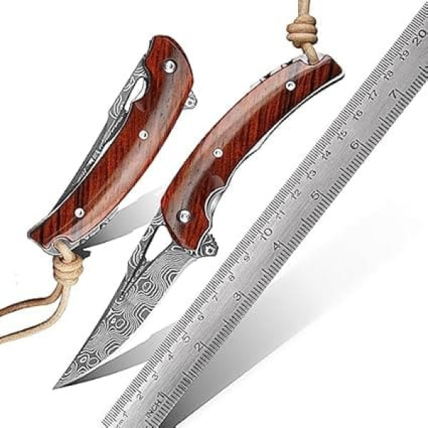 Professional quality: the blade is made of high quality stainless steel, very sharp and durable. Folding knives look great thanks to the combination of classic elements such as wood and modern materials such as steel. Technical data: total length: 17.3 cm/6.81 inches, blade length: 7.5 cm, 2.95 inches, blade thickness: 3 mm, 0.12 inches, net weight: approx. 85 g/2.99 oz. One-handed opening: with its flip function and feed lock, it is not only super easy, but can also be opened and closed with just one hand! HIGH QUALITY HANDLE The handle of this damascus knife is made of precious wood, non-slip, comfortable to the touch, easy to grip and well balanced. PERFECT GIFT: this beautiful folding knife is perfect for survival knives, hiking knives, rescue knives, camping knives, fishing knives, work knives, carving knives; This pocket knife is also a great gift for men, friends, father's birthday or Christmas gift › See more product details; Product description VG10Damascus Steel Folding Pocket Knife Product type: outdoor folding knife. Blade material: VG10 steel. Handle material: rosewood Blade hardness: 60-62HRC. Total length: 17.3 cm / 6.81 inches. Blade length: 7.5 cm, 2.95 inches. Blade thickness: 3 mm, 0.12 inches. Net weight: approx. 85 g / 2.99 oz. Spindle system: double row ball system. Scope of application: outdoor sports, self-driving trip, gift tools, collection,; Product description VG10Damascus Steel Folding Pocket Knife Product type: outdoor folding knife. Blade material: VG10 steel. Handle material: rosewood Blade hardness: 60-62HRC. Total length: 17.3 cm / 6.81 inches. Blade length: 7.5 cm, 2.95 inches. Blade thickness: 3 mm, 0.12 inches. Net weight: approx. 85 g / 2.99 oz. Spindle system: double row ball system. Scope of application: outdoor sports, self-driving trip, gift tools, collection,; VG10Damascus Steel Folding Pocket Knife Product type: outdoor folding knife. Blade material: VG10 steel. Handle material: rosewood Blade hardness: 60-62HRC. Total length: 17.3 cm / 6.81 inches. Blade length: 7.5 cm, 2.95 inches. Blade thickness: 3 mm, 0.12 inches. Net weight: approx. 85 g / 2.99 oz. Spindle system: double row ball system. Scope of application: outdoor sports, self-driving trip, gift tools, collection,