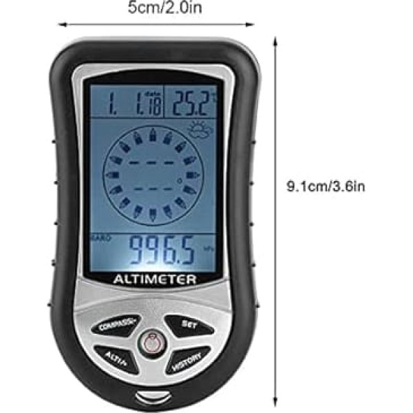 DURABLE CONSTRUCTION Made of tough ABS plastic that ensures durability and resistance to impact. Advanced sensors: equipped with a digital altimeter, barssometer and electronic compass for precise weather and altitude measurements. Portable and compact: designed for transportation with a portable weather forecast device that you can easily take with you on all your outdoor adventures. MULTIFUNCTIONAL DISPLAY: Features an LED backlight for visibility in low light conditions as well as a thermometer for temperature readings. EASY TO NAVIGATE: The weather altimeter barssometer compass is user-friendly and therefore the suitable outdoor companion for any explorer. › See more product details; Product description Specification: Condition: Item Type:Altimeter Material: ABS Weight: approx. 92 g 3.2 oz. Product size: approx. 9.1 x 5 cm / 3.6 x 2.0 inches. Colour: black. Battery: 2 x AAA battery (not included). Function: Altimeter (range): up to 999.9 metres 80 feet (resolution io of 9 feet). Barometer (range): 350 mbar 1100 mbar (resolution io 0.1 mbar) Digital compass: display of bearing in degrees and base points Thermometer (range): 10 degrees to +60 degrees, (format): °F °C Weather Forecast: start the device, you can predict the weather within 12 24 hours, the effective range is 30 50 km LED BACKLIGHT - Press any button in any state to turn on the backlight. When the backlight is on, press any button to extend the time by 5 seconds Clock format: 12 hours. 24 hours. (AM PM) Package list: 1 x Digital Altimeter (batteries not included) 1 x rope. 1 x user manual (English language Note: All data is measured manually and there may be errors in measurements. Monitors are calibrated differently, the colours shown in the photos may differ slightly from the reality. Please refer to the real object. 1. Please allow 0-2 cm error due to manual measurement. Thank you for your understanding. 2. Since monitors are calibrated differently, the colour of the item shown in the photos may differ slightly from the actual object. Please take the original as standard.; Product description Specification: Condition: Item Type:Altimeter Material: ABS Weight: approx. 92 g 3.2 oz. Product size: approx. 9.1 x 5 cm / 3.6 x 2.0 inches. Colour: black. Battery: 2 x AAA battery (not included). Function: Altimeter (range): up to 999.9 metres 80 feet (resolution io of 9 feet). Barometer (range): 350 mbar 1100 mbar (resolution io 0.1 mbar) Digital compass: display of bearing in degrees and base points Thermometer (range): 10 degrees to +60 degrees, (format): °F °C Weather Forecast: start the device, you can predict the weather within 12 24 hours, the effective range is 30 50 km LED BACKLIGHT - Press any button in any state to turn on the backlight. When the backlight is on, press any button to extend the time by 5 seconds Clock format: 12 hours. 24 hours. (AM PM) Package list: 1 x Digital Altimeter (batteries not included) 1 x rope. 1 x user manual (English language Note: All data is measured manually and there may be errors in measurements. Monitors are calibrated differently, the colours shown in the photos may differ slightly from the reality. Please refer to the real object. 1. Please allow 0-2 cm error due to manual measurement. Thank you for your understanding. 2. Since monitors are calibrated differently, the colour of the item shown in the photos may differ slightly from the actual object. Please take the original as standard.; Specification: Condition: Item Type:Altimeter Material: ABS Weight: approx. 92 g 3.2 oz. Product size: approx. 9.1 x 5 cm / 3.6 x 2.0 inches. Colour: black. Battery: 2 x AAA battery (not included). Function: Altimeter (range): up to 999.9 metres 80 feet (resolution io of 9 feet). Barometer (range): 350 mbar 1100 mbar (resolution io 0.1 mbar) Digital compass: display of bearing in degrees and base points Thermometer (range): 10 degrees to +60 degrees, (format): °F °C Weather Forecast: start the device, you can predict the weather within 12 24 hours, the effective range is 30 50 km LED BACKLIGHT - Press any button in any state to turn on the backlight. When the backlight is on, press any button to extend the time by 5 seconds Clock format: 12 hours. 24 hours. (AM PM) Package list: 1 x Digital Altimeter (batteries not included) 1 x rope. 1 x user manual (English language Note: All data is measured manually and there may be errors in measurements. Monitors are calibrated differently, the colours shown in the photos may differ slightly from the reality. Please refer to the real object. 1. Please allow 0-2 cm error due to manual measurement. Thank you for your understanding. 2. Since monitors are calibrated differently, the colour of the item shown in the photos may differ slightly from the actual object. Please take the original as standard.