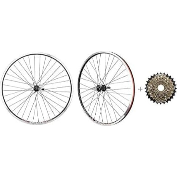 Lightweight and strong: 26 inch wheel set rim material: alloy 6061-T6. Rim wall: double-walled valve hole: 8 mm A/V. Inner width: 18 mm. Much lighter than a low steel rim and strong enough for daily driving. Compatibility: Only compatible with 6 speed calliper brake and 26 inch clincher tyres. Brake Interface: Rim Brake CNC Brake Surface (Rim Brakes) Tyre Type: Clincher ED Black Steel Spokes Brass CP Nipple High quality hubs: Joytech hubs. Holes: 36 Case Material: Aluminum Axle material: steel Front Axle Size: 9mm x 100mm Rear Axle Size:10x135mm QR Quality freewheel: compatible with Shimano MF-TZ500-6 freewheel. Speed: 6 Speeds Use: Tourney Bike.Transmission: 14-16-18-21-24-28 Chain Compatibility: 3/32 inch Box contents: front and rear wheels, hubs, QR, rim tape, freewheel. Weight: 2331g = 2.3kg Warranty: 2 years. Made in Taiwan. › See more product details; Product description Lightweight and strong: 26 inch wheelset Rim material: alloy 6061-T6. Rim wall: double-walled, valve hole: 8 mm A/V. Inner width: 18 mm. Much lighter than low-end steel rim and strong enough for daily riding. COMPATIBILITY Only compatible with 6 speed, caliper brake and clincher with 26 inch tires. Brake Interface: Caliper Brake CNC braking surface (rim brakes) Fit tire type: clincher. ED black steel spokes. Brass CP nipple. High Quality Hubs: Joytech Hubs Holes: 36 Body material: aluminium. Axle material: steel. Front axle size: 9 x 100 mm. Rear axle size: 10 x 135 mm. High quality freewheel: compatible with Shimano MF-TZ500-6 freewheel. Speed: 6 speed Area of application: tourney bike gears: 14-16-18-21-24-28 chain compatibility: 3/32 inches.; Product description Lightweight and strong: 26 inch wheelset Rim material: alloy 6061-T6. Rim wall: double-walled, valve hole: 8 mm A/V. Inner width: 18 mm. Much lighter than low-end steel rim and strong enough for daily riding. COMPATIBILITY Only compatible with 6 speed, caliper brake and clincher with 26 inch tires. Brake Interface: Caliper Brake CNC braking surface (rim brakes) Fit tire type: clincher. ED black steel spokes. Brass CP nipple. High Quality Hubs: Joytech Hubs Holes: 36 Body material: aluminium. Axle material: steel. Front axle size: 9 x 100 mm. Rear axle size: 10 x 135 mm. High quality freewheel: compatible with Shimano MF-TZ500-6 freewheel. Speed: 6 speed Area of application: tourney bike gears: 14-16-18-21-24-28 chain compatibility: 3/32 inches.; Lightweight and strong: 26 inch wheelset Rim material: alloy 6061-T6. Rim wall: double-walled, valve hole: 8 mm A/V. Inner width: 18 mm. Much lighter than low-end steel rim and strong enough for daily riding. COMPATIBILITY Only compatible with 6 speed, caliper brake and clincher with 26 inch tires. Brake Interface: Caliper Brake CNC braking surface (rim brakes) Fit tire type: clincher. ED black steel spokes. Brass CP nipple. High Quality Hubs: Joytech Hubs Holes: 36 Body material: aluminium. Axle material: steel. Front axle size: 9 x 100 mm. Rear axle size: 10 x 135 mm. High quality freewheel: compatible with Shimano MF-TZ500-6 freewheel. Speed: 6 speed Area of application: tourney bike gears: 14-16-18-21-24-28 chain compatibility: 3/32 inches.