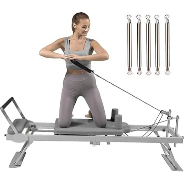Pilates reformer: The foldable Pilates reformer machine is made entirely of high-quality metal and is very suitable for home use, yoga and studio gyms and offices. Suitable for fitness enthusiasts, yoga, sports and body shaping enthusiasts, people who want to lose weight. Even beginners and office workers with basic training can relieve joints and correct the body shape. Pilates reformer with aluminium rails and beautiful leather padding: the aluminium slide rails ensure more smoothness. Remember to clean it before and after each use. The sledge pad of this Pilates device is also thick and beautiful. 47 cm above the ground, helps to avoid frequent sitting and standing and makes training at home easier especially for the elderly. Easy to assemble and fold: This foldable Pilates reformer device is 95% pre-assembled and easy to fold. The volume is halved when folded. It has wheels and is easy to move and store. It is particularly practical for people who live in apartments. Savings: If you can't go to the Pilates studio but still want to maintain your training routine, this reformer is ideal. Thanks to the low price, you save membership fees and quickly amortize your costs. When training at home, you don't have to stick to a fixed schedule. Function: Our reformer will help you continue your Pilates journey. The system supports you during exercises for core, strength, flexibility, balance and cardio and thus trains the entire body. The fitness device comes as a single device and offers you additional options thanks to the adjustable foot bar. › See more product details; Product description OPTIMIZE YOUR WORKOUT: The Pilates Reformer supports you in exercises for core, strength, flexibility, balance and cardio that train the body as a whole. In combination with Pilates training and a balanced diet, you can effortlessly lose weight, shape your body, increase your strength and relieve stress. Note: Colour: The product images are of the original. However, due to lighting and screen settings, there may be colour differences. Thank you for your understanding. Size: the product size is measured manually. Please allow 1-2cm deviation. Thank you for your understanding.; Product description OPTIMIZE YOUR WORKOUT: The Pilates Reformer supports you in exercises for core, strength, flexibility, balance and cardio that train the body as a whole. In combination with Pilates training and a balanced diet, you can effortlessly lose weight, shape your body, increase your strength and relieve stress. Note: Colour: The product images are of the original. However, due to lighting and screen settings, there may be colour differences. Thank you for your understanding. Size: the product size is measured manually. Please allow 1-2cm deviation. Thank you for your understanding.; OPTIMIZE YOUR WORKOUT: The Pilates Reformer supports you in exercises for core, strength, flexibility, balance and cardio that train the body as a whole. In combination with Pilates training and a balanced diet, you can effortlessly lose weight, shape your body, increase your strength and relieve stress. Note: Colour: The product images are of the original. However, due to lighting and screen settings, there may be colour differences. Thank you for your understanding. Size: the product size is measured manually. Please allow 1-2cm deviation. Thank you for your understanding.