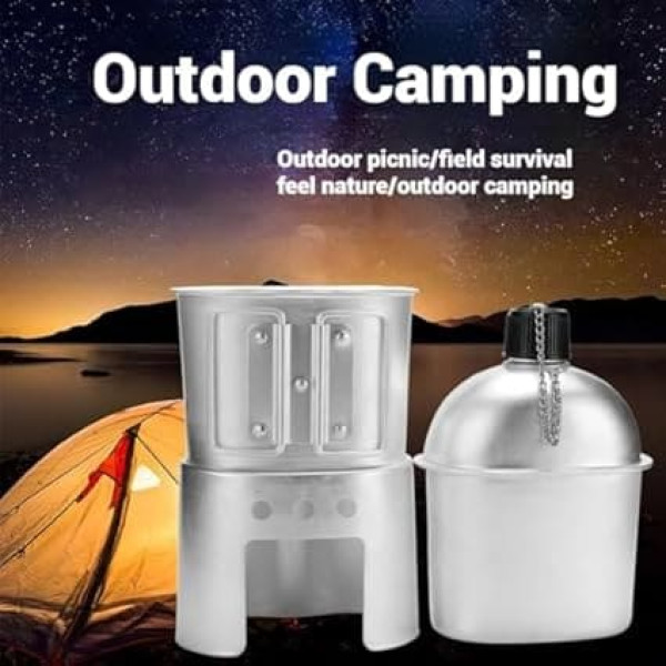 PREMIUM FOOD MATERIAL: Made of corrosion-resistant aluminum, manufactory and cup, food and drinks can be stored safely and easily and permanently. No metallic taste and no smell - just water and cook cleanly every time you go outside ENERGY SAVING WOOD STOVE DESIGN The included stove has vents and a wide mouth to save efficient combustion and fuel. Perfectly compatible with manufactory and mug for cooking, heating or boiling water when camping or in emergency situations COMPLETE OUTDOOR COOKING SET This 4 piece set includes a 30oz shovel window, a 20oz tumbler, a wood stove with ventilation and a green carry bag. Everything you need for hiking, survival, hunting or backpacking in a compact and convenient packaging Lightweight and travel area: the compact folding design fits perfectly into the included carry bag for easy storage. Thanks to the folding handles and portable design, this set is ideal for easy packing while enjoying the basic outdoor cooking elements MADE FOR ALL OUTDOOR SCENARIOS Whether camping, hiking, hunting or preparing for survival, this military kitchenware set will keep food warm and drinks cool. A reliable companion for both beginners and experienced travellers › See more product details; Product description Specifications: Name: Military Cantine Material: aluminium. Size: as shown in the picture. Weight: 410 g. Package Content: 1 set x military mannering bar. 1 x spoon. 1 x fork. Notes: 1. Please allow slight differences due to manual measurement. 2. Due to the different display and different light, the picture may not show the actual colour of the item. Thank you for your understanding.; Product description Specifications: Name: Military Cantine Material: aluminium. Size: as shown in the picture. Weight: 410 g. Package Content: 1 set x military mannering bar. 1 x spoon. 1 x fork. Notes: 1. Please allow slight differences due to manual measurement. 2. Due to the different display and different light, the picture may not show the actual colour of the item. Thank you for your understanding.; Specifications: Name: Military Cantine Material: aluminium. Size: as shown in the picture. Weight: 410 g. Package Content: 1 set x military mannering bar. 1 x spoon. 1 x fork. Notes: 1. Please allow slight differences due to manual measurement. 2. Due to the different display and different light, the picture may not show the actual colour of the item. Thank you for your understanding.