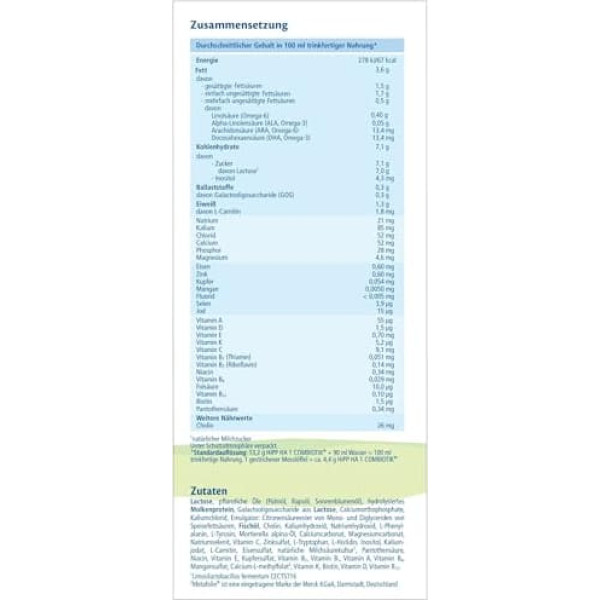 For sensitive immune systems - with hydrolyzed protein Natural Lactic Acid Cultures - Originally derived from breast milk, breast milk contains a variety of natural cultures that can be individually different Valuable fibre GOS galactooligosaccharides derived from lactose LCP (Omega-3 and 6) Only lactose contains: can be given like breast milk as needed - as often and as much your baby wants to drink › See more product details; Product description Product Description HiPP HA COMBIOTIK is our latest generation HA food with a hydrolyzed protein and the unique combination of valuable ingredients: natural lactic acid cultures, LCP (omega-3 and -6) and valuable fibre (GOS). Ingredients Ingredients: lactose, vegetable oils (palm oil +, rapeseed oil, sunflower oil), hydrolyzed whey protein, galactooligosaccharides from lactose, calcium orthophosphates, potassium chloride, emulsifier: citric acid esters of mono- and diglycerides of fatty acids, fish oil 1), choline, potassium. hydroxide, hydroxide, hydroumhydroxide, L-phenylalanine, L-tyrosine, Mortierella alpina oil, calcium carbonate, magnesium carbonate, sodium selenite, vitamin C, zinc sulphate, L-tryptophan, L-histidine, inositol, potassium iodate, L-carnitine, iron sulphate, natural lactic acid culture (Limosilactobacillus fermentum hereditum®. 2))), ), ), ), enic acid, niacin, vitamin E, copper sulphate, vitamin B2, vitamin B1, vitamin A, vitamin B6, manganese sulphate, calcium L-methylfolate3, vitamin K, biotin, vitamin D, vitamin B12. 1) Contains DHA (legally required for infant formula). DHA belongs to the family of omega-3 fatty acids. 2) Limosilactobacillus fermentum CECT5716 3) Calcium L-methylfolate = Metafolin®. Metafolin® is a registered trademark of Merck KGaA, Darmstadt, Germany. + Palm oil from sustainable cultivation, certified by independent control bodies Directions Preparation: Follow the instructions for use when preparing. Improper preparation or storage over a long period of time can lead to health impairments, e.g. B. through the growth of unwanted germs. Therefore, prepare food fresh before each meal and feed immediately. Do not reuse food residue. Thoroughly clean the bottle, teat and ring. Do not heat the food in the microwave (risk of scalding). 1. Boil fresh drinking water and apply to approx. 40° - 50°C*. 2. Add the desired amount of boiled water (see table) into a bottle. 3. Measure the recommended amount of powder (see table). Fill measuring spoons loosely and strip off. Add powder to water. 4. Close the bottle and shake vigorously several times. 5. At drinking temperature approx. 37 °C. Check temperature, e.g. with HiPP thermometer. *In order not to damage the natural lactic acid cultures (lactobacilli), please do not prepare the food with too hot water. Drinking quantity and dosage drinking quantity per bottle can be individually different. Recommended drinking quantities and number of bottles per day are guidelines. Your baby does not necessarily have to drink the bottle empty. Please use only the enclosed measuring spoon. For a measuring spoon of powder, you need 30 ml of water. 1 level measuring spoon = approx. 4.4 g HiPP HA 1 COMBIOTIK® 1.-2. Week*: 7-8 bottle meals per day, 60 ml of boiled water + 2 measuring spoons of powder = 70 ml ready-to-drink food. 3-4. Week: 5-7 bottle meals per day, 90 ml of boiled water + 3 scoops of powder = 100 ml ready-to-drink food. 5.-8. Week: 5-6 bottle meals per day, 120 ml of boiled water + 4 measuring spoons of powder = 135 ml ready-to-drink food. 3-4. Month: 5 bottle meals per day, 150ml boiled water + 5 scoops of powder = 170ml ready to drink food. From 5. Month**: 4-5 bottle meals per day, 180 ml boiled water + 6 scoops of powder = 200 ml ready-to-drink food. From 6. Month: 4 bottle meals per day, 210 ml of boiled water + 7 scoops of powder = 235 ml ready to drink food. *Unless otherwise recommended by the doctor. **From the 5th month you can start with glasses and porridges in consultation with the pediatrician. Babies need approx. 5 meals per day. With every newly introduced glass and porridge meal, one bottle meal should be eliminated. Manufacturer Contact Information D-85273 PFAFFENHOFEN See more; Product description Product Description HiPP HA COMBIOTIK is our latest generation HA food with a hydrolyzed protein and the unique combination of valuable ingredients: natural lactic acid cultures, LCP (omega-3 and -6) and valuable fibre (GOS). Ingredients Ingredients: lactose, vegetable oils (palm oil +, rapeseed oil, sunflower oil), hydrolyzed whey protein, galactooligosaccharides from lactose, calcium orthophosphates, potassium chloride, emulsifier: citric acid esters of mono- and diglycerides of fatty acids, fish oil 1), choline, potassium. hydroxide, hydroxide, hydroumhydroxide, L-phenylalanine, L-tyrosine, Mortierella alpina oil, calcium carbonate, magnesium carbonate, sodium selenite, vitamin C, zinc sulphate, L-tryptophan, L-histidine, inositol, potassium iodate, L-carnitine, iron sulphate, natural lactic acid culture (Limosilactobacillus fermentum hereditum®. 2))), ), ), ), enic acid, niacin, vitamin E, copper sulphate, vitamin B2, vitamin B1, vitamin A, vitamin B6, manganese sulphate, calcium L-methylfolate3, vitamin K, biotin, vitamin D, vitamin B12. 1) Contains DHA (legally required for infant formula). DHA belongs to the family of omega-3 fatty acids. 2) Limosilactobacillus fermentum CECT5716 3) Calcium L-methylfolate = Metafolin®. Metafolin® is a registered trademark of Merck KGaA, Darmstadt, Germany. + Palm oil from sustainable cultivation, certified by independent control bodies Directions Preparation: Follow the instructions for use when preparing. Improper preparation or storage over a long period of time can lead to health impairments, e.g. B. through the growth of unwanted germs. Therefore, prepare food fresh before each meal and feed immediately. Do not reuse food residue. Thoroughly clean the bottle, teat and ring. Do not heat the food