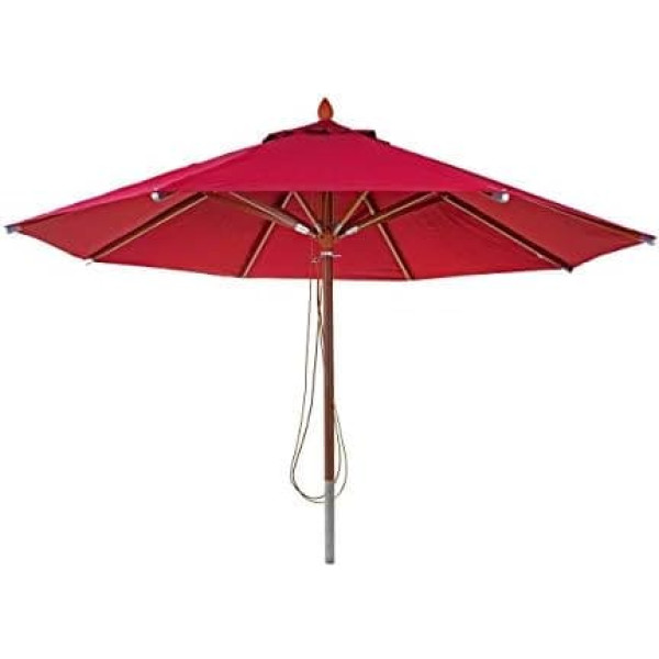 Brand owner is QM ISO9001 certified. Proof + information can be found in the imprint. This is not a product certification. Box contents: wooden parasol, opening mechanism: hand cable, shockproof, sturdy struts, pole made of sturdy 5 cm hardwood, mast ends protected by aluminium sleeve, water and dirt-repellent fabric, strut caps made of aluminium, wind roof Dimensions (H x L x W): 294 x 400 x 400 cm. Material: frame: wood. Strut caps: aluminium. Pole end: aluminium sleeve. Fabric/cover: 100% polyester, 240g/m². Colour: frame: brown. Fabric / cover: burgundy Dimensions (approx. ): Total height: 294 cm. Wingspan: 400 cm. Side dimensions: 200 cm. Strut thickness: 1 in. Passage height: 215 cm. Pole diameter: 4.8 cm. Material: Frame: wood. Strut caps: aluminium. Pole end: aluminium sleeve. Fabric/cover: 100% polyester, 240 g/m². › See more product details