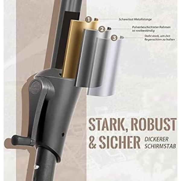 Dimensions and material – size: 220 × 400 cm, umbrella height: 240 cm. Diameter of the rod: 38 mm, umbrella cover made of 100% polyester Ventilation and safety strap: A wind outlet on the top of the parasol reduces wind sensitivity and a practical safety belt ensures stability and safety Easy crank system: The robust frame and innovative crank technology allow for effortless assembly for everyday use. Simply press, lift and crank the umbrella to the desired position This parasol offers better protection against low sun as well as good UV protection thanks to its design as a double parasol. The polyester fibre umbrella cover is 100% waterproof, can be easily removed and can be washed Attention and care: Cover the umbrella when not in use, and safely store it dry to avoid damage and ensure a long service life. For even weight distribution, use a sturdy base filled with sand or water. › See more product details; Product description Sun umbrella; Product description Sun umbrella; Sun umbrella