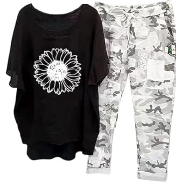 Briskorry Women's Two-Piece T-Shirt Top and Trousers, Trouser Suit, Casual Loose Leisure Suit, Short Sleeve, Round Neck Sports Suit, Lightweight, Airy Muslin Set, Sexy Print, Festive