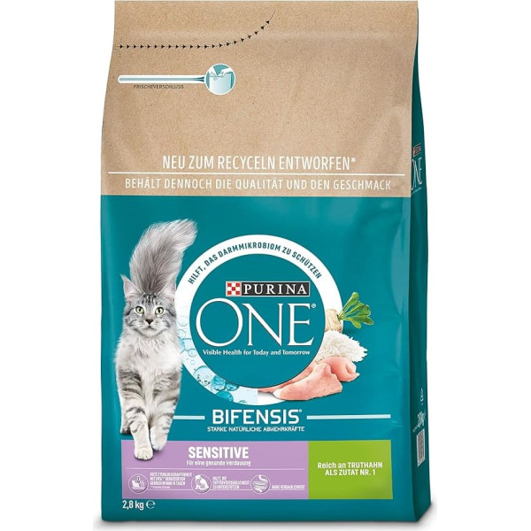 Good stool texture with 24% less odour in 14 days, thanks to natural fibre No added wheat to help support feed compatibility Helps keep skin and coat radiantly healthy thanks to omega-3 and 6 fatty acids and essential vitamins and minerals Helps maintain strong and healthy bones thanks to minerals and vitamin D High digestibility thanks to high-quality ingredients › See more product details; Product description Product Description PURINA ONE® Sensitive has been specially developed for the health and well-being of cats with sensitive digestion and picky appetite. A balanced gut microbiome, also known as intestinal flora, is essential for your cat's health. It has a direct impact on their natural defences. The microbiome is an ecosystem with trillions of microorganisms that live in the gut and are unique to each cat. The balance of microorganisms is important because it has a positive effect on the healthy digestion, natural defences and overall well-being of your cat. PURINA ONE® BIFENSIS® is a nutritional formula with beneficial functional bacteria: Lactobacillus, which has been scientifically proven to strengthen your cat's natural defenses from the inside out and helps to protect a regulated gut microbiome. PURINA ONE® BIFENSIS® contains high-quality ingredients, including the prebiotic chicory, which nourishes the good bacteria in the intestine to improve your cat's gut microbiome and maintain its health. From regulated digestion and strong, natural defences to a shiny coat, you can see visible results for your cat's health today and tomorrow. Indications sensitive stomach, adult Ingredients Composition turkey (18%) (including bones, meat, skin), rice (15%), dried turkey protein, corn, corn protein flour, pea protein, animal fats, soy flour, dried chicory root* (2%), minerals, autolysate (enriched with 0.025% heat-treated Lactobacillus delbrueckii and fermentum powder), Heat. Fish oil. Directions Feeding recommendation Recommended daily amount (g/day) Cat weight: Quantity: 2-4 kg 30 – 55 g 4-6 kg 55 – 85 g 6-8 kg 85 – 110 g The recommended daily amounts should be based on the weather, the activity level of the cat and its general physical condition. Clean, fresh drinking water should be available at all times. See more; Product description Product Description PURINA ONE® Sensitive has been specially developed for the health and well-being of cats with sensitive digestion and picky appetite. A balanced gut microbiome, also known as intestinal flora, is essential for your cat's health. It has a direct impact on their natural defences. The microbiome is an ecosystem with trillions of microorganisms that live in the gut and are unique to each cat. The balance of microorganisms is important because it has a positive effect on the healthy digestion, natural defences and overall well-being of your cat. PURINA ONE® BIFENSIS® is a nutritional formula with beneficial functional bacteria: Lactobacillus, which has been scientifically proven to strengthen your cat's natural defenses from the inside out and helps to protect a regulated gut microbiome. PURINA ONE® BIFENSIS® contains high-quality ingredients, including the prebiotic chicory, which nourishes the good bacteria in the intestine to improve your cat's gut microbiome and maintain its health. From regulated digestion and strong, natural defences to a shiny coat, you can see visible results for your cat's health today and tomorrow. Indications sensitive stomach, adult Ingredients Composition turkey (18%) (including bones, meat, skin), rice (15%), dried turkey protein, corn, corn protein flour, pea protein, animal fats, soy flour, dried chicory root* (2%), minerals, autolysate (enriched with 0.025% heat-treated Lactobacillus delbrueckii and fermentum powder), Heat. Fish oil. Directions Feeding recommendation Recommended daily amount (g/day) Cat weight: Quantity: 2-4 kg 30 – 55 g 4-6 kg 55 – 85 g 6-8 kg 85 – 110 g The recommended daily amounts should be based on the weather, the activity level of the cat and its general physical condition. Clean, fresh drinking water should be available at all times. See more; Product Description PURINA ONE® Sensitive has been specially developed for the health and well-being of cats with sensitive digestion and picky appetite. A balanced gut microbiome, also known as intestinal flora, is essential for your cat's health. It has a direct impact on their natural defences. The microbiome is an ecosystem with trillions of microorganisms that live in the gut and are unique to each cat. The balance of microorganisms is important because it has a positive effect on the healthy digestion, natural defences and overall well-being of your cat. PURINA ONE® BIFENSIS® is a nutritional formula with beneficial functional bacteria: Lactobacillus, which has been scientifically proven to strengthen your cat's natural defenses from the inside out and helps to protect a regulated gut microbiome. PURINA ONE® BIFENSIS® contains high-quality ingredients, including the prebiotic chicory, which nourishes the good bacteria in the intestine to improve your cat's gut microbiome and maintain its health. From regulated digestion and strong, natural defences to a shiny coat, you can see visible results for your cat's health today and tomorrow. Indications sensitive stomach, adult Ingredients Composition turkey (18%) (including bones, meat, skin), rice (15%), dried turkey protein, corn, corn protein flour, pea protein, animal fats, soy flour, dried chicory root* (2%), minerals, autolysate (enriched with 0.025% heat-treated Lactobacillus delbrueckii and fermentum powder), Heat. Fish oil. Directions Feeding recommendation Recommended daily amount (g/day) Cat weight: Quantity: 2-4 kg 30 – 55 g 4-6 kg 55 – 85 g 6-8 kg 85 – 110 g The recommended daily amounts should be based on the weather, the activity level of the cat and its general physical condition. Clean, fresh drinking water should be available at all tim