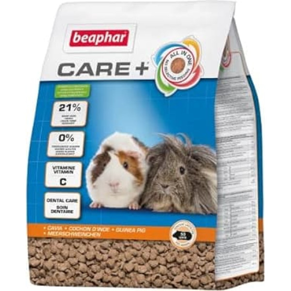 Health promotion: Care+ guinea pig food supports the overall health and well-being of your pet. With a high raw fibre content of 21%, it promotes optimal digestion. All in one feed core – no food selection: this food is rich in vitamin C and contains valuable ingredients such as green tea extract, echinacea, spirulina and vitamin E. Each feed core is identical in its nutrient composition, which ensures a balanced diet. Teeth health: the specially hardened feed cores ensure natural wear of the teeth. In addition, Care+ contains important omega-3 and omega-6 fatty acids that contribute to the overall health of your guinea pig. Easy to use: give your guinea pig 30-50g Care+ daily. Always provide fresh water and enough hay. Our animals are our family: the family business beaphar founded in 1942 is one of the main players in the pet supplies market. It offers high-quality care items, treats as well as tick and flea protection products at affordable prices. › See more product details; Product description Product Description Bernard Aa, driven by his family's passion for pets, laid the foundation for Beaphar in 1942. The Dutch family business, now managed by the founder's grandson, strives to constantly improve the health and well-being of our loyal companions. The beaphar company is characterised by its tireless pursuit of innovation and quality. beaphar care products are manufactured in a GMP certified (Good Manufacturing Practice) company that guarantees compliance with strict quality standards. Our affordable product range includes solutions for parasite protection, skin and coat care, nutrition and much more. With beaphar you benefit from the passion and experience of a family business dedicated to improving the living conditions of your pets. Indications All ages, small mammals Ingredients Cereals, vegetable by-products (including dried balm leaves 0.10%, lime blossom dried 0.03%), vegetable protein extracts, seeds, minerals, yeasts (including MOS 0.20%), vegetables, Yucca Schidigera 0.20%, algae (spirulina 0.01%). Directions Give your guinea pig 30-50 g Care+ daily. Always provide fresh water and enough hay. Box Contains 1 Beutel Meerschweinchenfutter Care+ See more; Product description Product Description Bernard Aa, driven by his family's passion for pets, laid the foundation for Beaphar in 1942. The Dutch family business, now managed by the founder's grandson, strives to constantly improve the health and well-being of our loyal companions. The beaphar company is characterised by its tireless pursuit of innovation and quality. beaphar care products are manufactured in a GMP certified (Good Manufacturing Practice) company that guarantees compliance with strict quality standards. Our affordable product range includes solutions for parasite protection, skin and coat care, nutrition and much more. With beaphar you benefit from the passion and experience of a family business dedicated to improving the living conditions of your pets. Indications All ages, small mammals Ingredients Cereals, vegetable by-products (including dried balm leaves 0.10%, lime blossom dried 0.03%), vegetable protein extracts, seeds, minerals, yeasts (including MOS 0.20%), vegetables, Yucca Schidigera 0.20%, algae (spirulina 0.01%). Directions Give your guinea pig 30-50 g Care+ daily. Always provide fresh water and enough hay. Box Contains 1 Beutel Meerschweinchenfutter Care+ See more; Product Description Bernard Aa, driven by his family's passion for pets, laid the foundation for Beaphar in 1942. The Dutch family business, now managed by the founder's grandson, strives to constantly improve the health and well-being of our loyal companions. The beaphar company is characterised by its tireless pursuit of innovation and quality. beaphar care products are manufactured in a GMP certified (Good Manufacturing Practice) company that guarantees compliance with strict quality standards. Our affordable product range includes solutions for parasite protection, skin and coat care, nutrition and much more. With beaphar you benefit from the passion and experience of a family business dedicated to improving the living conditions of your pets. Indications All ages, small mammals Ingredients Cereals, vegetable by-products (including dried balm leaves 0.10%, lime blossom dried 0.03%), vegetable protein extracts, seeds, minerals, yeasts (including MOS 0.20%), vegetables, Yucca Schidigera 0.20%, algae (spirulina 0.01%). Directions Give your guinea pig 30-50 g Care+ daily. Always provide fresh water and enough hay. Box Contains 1 Beutel Meerschweinchenfutter Care+ See more