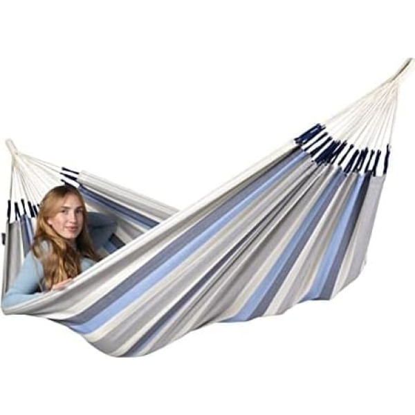 Handmade in Colombia: Traditional South American hammock for one or more people with a cloth width of 140 cm. Ideal for the garden: our functional fibre has been specially developed to meet the demands of outdoor hammocks. It is easy to clean, quick-drying and weather-resistant. Robust selvedge: by doubling the weft threads on the selvedges, it is reinforced and particularly tear-resistant. The double Brisa hammock: offers a lying surface of 140 cm and a total length of 300 cm. The length of the lying surface is 200 cm, and it can hold up to 130 kg. A minimum distance of 270 cm is required. For indoor and outdoor enjoyment: perfect for balcony, terrace, garden and bedroom - create your personal oasis of peace. › See more product details; Product description Product Description LA SIESTA® Brisa Sea Salt - Weather-Resistant Single Classic Hammock Safety Warning Please note: maximum weight recommendation 120 kg. Securely attach anchor hooks to sturdy brackets. Do not use without boom bars. Keep children away.; Product description Product Description LA SIESTA® Brisa Sea Salt - Weather-Resistant Single Classic Hammock Safety Warning Please note: maximum weight recommendation 120 kg. Securely attach anchor hooks to sturdy brackets. Do not use without boom bars. Keep children away.; Product Description LA SIESTA® Brisa Sea Salt - Weather-Resistant Single Classic Hammock Safety Warning Please note: maximum weight recommendation 120 kg. Securely attach anchor hooks to sturdy brackets. Do not use without boom bars. Keep children away.