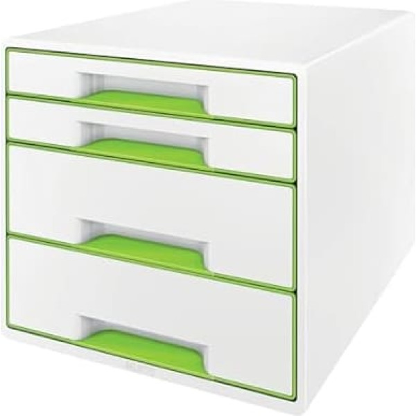 Green storage box with 4 drawers in A4 format in high gloss look, ideal for documents, pens, make-up, cables, kitchen utensils, medicines and remote controls, for home and office Two large and two small drawers: (W x H x D) 24.5 x 7.1 x 32.5 cm and 24.5 x 3.4 x 32.5 cm, for A4 documents, includes transparent drawer insert for organising smaller office utensils Practical drawers with pull-out stop and holding system, easy to use thanks to ergonomic handle holes, quick and easy identification of the contents using labelling labels Unique wow effect with this and other products from the Leitz range, up to 3 shelves stackable to save space, non-slip plastic feet, durable, stylish and wipe-clean plastic Box contents: 1 x Leitz Cube drawer set with 4 drawers, dimensions (W x H x D): 28.7 x 27 x 36.3 cm, weight: 3.46 kg, colour: green, wow, 52132054 › See more product details
