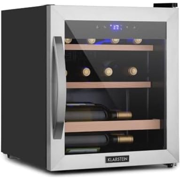 The wow factor for your wine: this stainless steel fridge with glass door features height-adjustable feet, UV protection and stylish interior lighting that makes this wine fridge a highlight in any room. PRESENT YOUR EXQUISITE WINE COLLECTION: In this fridge you can store up to 12 bottles of your best wines. Our drinks fridge ensures the right temperature so that the taste and aroma can develop perfectly. For the right storage of your wines: the right temperature is essential for wines. This 1 zone wine refrigerator can be adjusted between 4 C and 18 C to properly store red and white wines, rosé, prosecco and beer. Quiet for more ambience: thanks to the quiet motor and the elegant look, our drinks refrigerators are ideal for wine storage in your own home but also in a bar, restaurant or anywhere wine lovers meet. Easy to use: the touch panel allows you to adjust the temperature so that your wines are chilled and ready to serve. The LCD display shows the temperature so that each wine can be set to the perfect temperature. › See more product details; Product description Klarstein Wine fridge, drinks fridge freestanding, indoor/outdoor drink refrigerators narrow, wine fridge small, 1 zone fridge with glass door, fridge with UV protection. This drink fridge brings the wine from the restaurant home and allows you to build and store an exquisite wine collection. Wine refrigerators are specially made to protect your high-quality wine collection from damage caused by incorrect storage temperatures. This freestanding wine fridge is slim and fits in any home, kitchen or bar area and allows quick access to your best wines, chilled at the ideal temperature. Elegant design, easy to use With this fridge with glass door, you can control the temperatures for a long life of your wines while presenting your wine collection in a refined, beautiful way. This fridge uses a double-walled panoramic glass to allow a constant view of your collection. Our wine refrigerators are controlled via a touch panel that allows you to easily adjust the temperature. Features: 46 litre fridge for all types of wine Vibration-free storage and UV protection Removable shelves LCD display shows temperature in quiet operation Package includes: Wine fridge Multilingual user manual Dimensions: Internal dimensions: 34.6 x 40 x 42 cm (W x D x H) Operating noise: 40 dB; Product description Klarstein Wine fridge, drinks fridge freestanding, indoor/outdoor drink refrigerators narrow, wine fridge small, 1 zone fridge with glass door, fridge with UV protection. This drink fridge brings the wine from the restaurant home and allows you to build and store an exquisite wine collection. Wine refrigerators are specially made to protect your high-quality wine collection from damage caused by incorrect storage temperatures. This freestanding wine fridge is slim and fits in any home, kitchen or bar area and allows quick access to your best wines, chilled at the ideal temperature. Elegant design, easy to use With this fridge with glass door, you can control the temperatures for a long life of your wines while presenting your wine collection in a refined, beautiful way. This fridge uses a double-walled panoramic glass to allow a constant view of your collection. Our wine refrigerators are controlled via a touch panel that allows you to easily adjust the temperature. Features: 46 litre fridge for all types of wine Vibration-free storage and UV protection Removable shelves LCD display shows temperature in quiet operation Package includes: Wine fridge Multilingual user manual Dimensions: Internal dimensions: 34.6 x 40 x 42 cm (W x D x H) Operating noise: 40 dB; Klarstein Wine fridge, drinks fridge freestanding, indoor/outdoor drink refrigerators narrow, wine fridge small, 1 zone fridge with glass door, fridge with UV protection. This drink fridge brings the wine from the restaurant home and allows you to build and store an exquisite wine collection. Wine refrigerators are specially made to protect your high-quality wine collection from damage caused by incorrect storage temperatures. This freestanding wine fridge is slim and fits in any home, kitchen or bar area and allows quick access to your best wines, chilled at the ideal temperature. Elegant design, easy to use With this fridge with glass door, you can control the temperatures for a long life of your wines while presenting your wine collection in a refined, beautiful way. This fridge uses a double-walled panoramic glass to allow a constant view of your collection. Our wine refrigerators are controlled via a touch panel that allows you to easily adjust the temperature. Features: 46 litre fridge for all types of wine Vibration-free storage and UV protection Removable shelves LCD display shows temperature in quiet operation Package includes: Wine fridge Multilingual user manual Dimensions: Internal dimensions: 34.6 x 40 x 42 cm (W x D x H) Operating noise: 40 dB