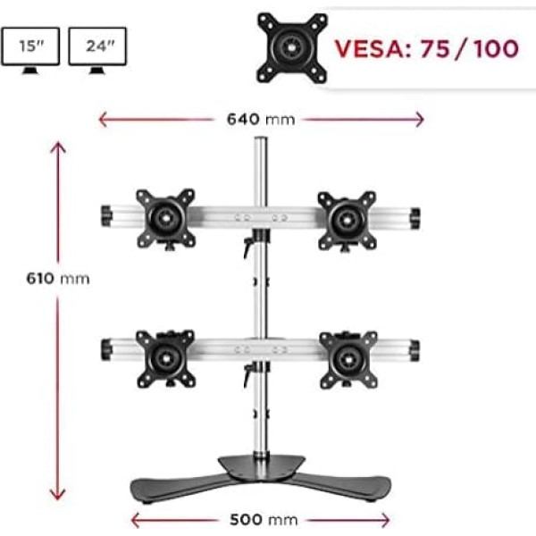 The Duronic DM754 is a desktop mount for 4 monitors that sit on the top of your desk. The DM754 has tilting double arms pf angle ±15° and the arm can rotate 360°. Please see movement image for full clarification This stand is suitable for monitors of a sizes between 15 to 24\
