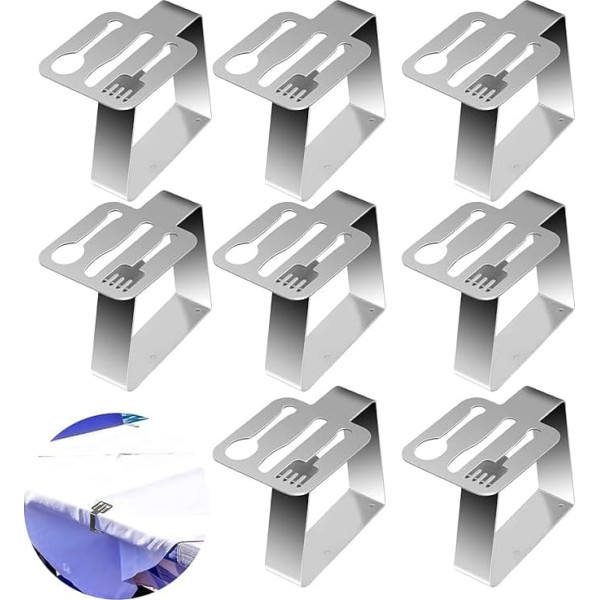 Fix the tablecloth in position: the tablecloth clip can firmly fix the tablecloth on the table. It will not loosen even if blown by wind or accidentally stumbled by a pet. So it can help you protect the expensive glasses and plates from tipping over. Very suitable for attaching tablecloths outdoors. Stainless Steel Material Our tablecloth clips are made of high quality stainless steel, strong, durable, not easy to break or deform. Even after prolonged use, they are still not easy to rust. Ideal for indoor and outdoor use. Wide Application These thickened tablecloth clips have a wide range of uses. They are suitable for outdoor and indoor activities such as pool parties, birthday parties, picnics, barbecues, weddings, garden dinners or other catering activities. An essential accessory for catering activities. Pretty Tableware Design This decorative 8 piece tablecloth clamp set has cute tableware pattern design. They have a pattern of fork, knife and spoon that match different types of tables. It will become your practical table assistant and personalized home decoration Easy to Use These pretty table clips are easy to put on and take off. All you need to do is adjust these clips to fix the tablecloth firmly. They will not scratch the tablecloth and can hold dishes safely and stably. You can have a nice meal with your family! › See more product details; Product description Exquisite set: Our decorative tablecloth clips set has 8 pieces. The sufficient number allows you to fix the tablecloth steadily without worrying about the tablecloth falling off. This is a good tool for you to host a happy family dinner. MULTIPURPOSE These metal tablecloth clamp holders are suitable for outdoor and indoor use. For example, they can be used at picnics, garden barbecues, birthday parties, wedding receptions, company dinners, fairs, buffets and so on. Thanks to its versatile purpose, you can enjoy delicious food casually. Beautiful shape: The tablecloth clip contains 8 pieces of stainless steel tablecloth clips. All of them have cute shapes, just like fork, knife and spoon. These beautiful tableware designs can decorate your tablecloth. When you have a picnic with your children, they will love the beautiful tablecloth clips. Durable material: This metal tablecloth clip is made of stainless steel that resists rust and is very durable. The edges of these table clips are smooth and burr-free, so they can protect your tablecloth from scratches or rubbing. They can also be reused, ideal for dining tables. One-step installation: The tablecloth clip is easy to install and remove, carefully open the clip and cut it into the table top. Then the table and the tablecloth are tightly attached. Very practical and fast. It is the ideal choice for families and restaurants. Specification: Colour: silver. Material: stainless steel. Size: as shown in the picture. Package includes: 8 x Tablecloth Clamp; Product description Exquisite set: Our decorative tablecloth clips set has 8 pieces. The sufficient number allows you to fix the tablecloth steadily without worrying about the tablecloth falling off. This is a good tool for you to host a happy family dinner. MULTIPURPOSE These metal tablecloth clamp holders are suitable for outdoor and indoor use. For example, they can be used at picnics, garden barbecues, birthday parties, wedding receptions, company dinners, fairs, buffets and so on. Thanks to its versatile purpose, you can enjoy delicious food casually. Beautiful shape: The tablecloth clip contains 8 pieces of stainless steel tablecloth clips. All of them have cute shapes, just like fork, knife and spoon. These beautiful tableware designs can decorate your tablecloth. When you have a picnic with your children, they will love the beautiful tablecloth clips. Durable material: This metal tablecloth clip is made of stainless steel that resists rust and is very durable. The edges of these table clips are smooth and burr-free, so they can protect your tablecloth from scratches or rubbing. They can also be reused, ideal for dining tables. One-step installation: The tablecloth clip is easy to install and remove, carefully open the clip and cut it into the table top. Then the table and the tablecloth are tightly attached. Very practical and fast. It is the ideal choice for families and restaurants. Specification: Colour: silver. Material: stainless steel. Size: as shown in the picture. Package includes: 8 x Tablecloth Clamp; Exquisite set: Our decorative tablecloth clips set has 8 pieces. The sufficient number allows you to fix the tablecloth steadily without worrying about the tablecloth falling off. This is a good tool for you to host a happy family dinner. MULTIPURPOSE These metal tablecloth clamp holders are suitable for outdoor and indoor use. For example, they can be used at picnics, garden barbecues, birthday parties, wedding receptions, company dinners, fairs, buffets and so on. Thanks to its versatile purpose, you can enjoy delicious food casually. Beautiful shape: The tablecloth clip contains 8 pieces of stainless steel tablecloth clips. All of them have cute shapes, just like fork, knife and spoon. These beautiful tableware designs can decorate your tablecloth. When you have a picnic with your children, they will love the beautiful tablecloth clips. Durable material: This metal tablecloth clip is made of stainless steel that resists rust and is very durable. The edges of these table clips are smooth and burr-free, so they can protect your tablecloth from scratches or rubbing. They can also be reused, ideal for dining tables. One-step installation: The tablecloth clip is easy to install and remove, carefully open the clip and cut it into the table top. Then the table and the tablecloth are tightly attached. Very practical and fast. It is the ideal choice for families and restaurants. Specification: Colour: silver. Material: stainless steel. Size: as shown in the picture. Package includes: 8 x Tablecloth Clamp