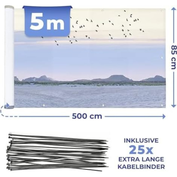 Protection: balcony privacy screen with coastal landscape from Maximex provides effective privacy and wind protection while you enjoy the view relaxed UV and weather resistant: the tear-resistant, fibreglass reinforced film ensures durability and colour fastness in all weather conditions Adaptable to any size: can be individually cut to fit perfectly on the balcony or patio COMPLETE FITTING KIT: Includes 25 UV resistant extra-long cable ties for a secure and durable attachment Design: balcony surround with coastal charm sets stylish accents outdoors, ideal for balconies and patios, dimensions: length 5 m, height 85 cm › See more product details