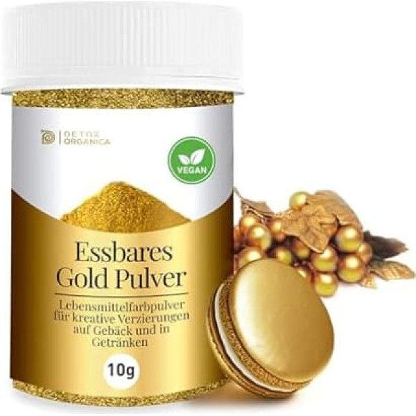 Gold Gold Gold! Edible gold powder - whether on cakes, muffins, chocolate or in drinks - the versatility of our gold powder knows no limits! What has recently been used by crowned confectioners now also conquers German kitchens Very trendy: gold powder edible for cakes! Whether young or old, everyone loves beautiful decorations on delicious cakes. Dusted as gold glitter or diluted as a glaze for painting, the powder conjures up a glamour shimmer on your desserts Glamorous - Mixed in drinks, our food glitter for drinks adds a luxurious touch to chic cocktail parties or romantic evenings for two! High quality - trust our high-quality food colour gold. and creatively decorate your favourite recipes. New formula: without E171! Contents: 10 g edible gold powder German customer service - Detox Organica, a French company, selects its suppliers thanks to the support of a nutrition specialist. If we have not met your expectations, please feel free to contact us › See more product details