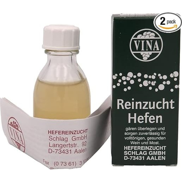 For up to 200 litres of wine Perfect for apples and pears Up to 18% alcohol possible Recommended for: apples, pears, rhubarb, quince but also grape wines Fermentation possible at low temperatures (from 5°). Yeast breed cold fermentation yeast is particularly recommended at low fermentation temperatures - due to cellar or season › See more product details; Product description Product description Germany Vina pure cultivated yeast 100 L. Application: - Stir directly into the fruit juice or into the mash or approx. Prepare a starter approach 3 days in advance (recommended for wine approaches with high sugar content) - balloon culture is also only fully added with 10 L approach. When distributed over 2 balloons, the yeast is first added to a 1/2 litre of juice and then stirred evenly. - Do not shake bottle before opening as it is under carbon dioxide pressure. Rinse the bottle several times with juice until the root is completely dissolved. - Avoid temperatures above 32°C, otherwise the yeast cells will be destroyed. Attention: the yeast cells must not be exposed to cold shock. When adding and during fermentation, the temperature differences or fluctuations should not be above 5-6°C. Starter approach: (with high sugar content, unfavourable temperature conditions, when fixing fermentation). In approx. 1/4 to 1/2 litre of boiled and cooled fruit juice or commercially available fermentable apple juice is added to the culture bottle of pure yeast and set at room temperature in a bottle - closed with a cotton ball - 2 to 3 days at room temperature. Then mix to the prepared wine base or mash. For more information on how to proceed, please refer to the enclosed instruction manual. Ingredients: liquid yeast net capacity: min. 28 ml. Manufacturer: Hefereinzucht Schlag GmbH, Langertstr. 92, D-73431 Aalen Country of origin: Germany Directions 2 x Vina pure breeding yeast cold fermentation yeast for up to 100 litres of wine: direct addition to the fruit juice or stir into the mash or approx. Prepare a starter approach 3 days in advance (recommended for wine approaches with high sugar content) - balloon culture is also only fully added with 10 L approach. When distributed over 2 balloons, the yeast is first added to a 1/2 litre of juice and then stirred evenly. - Do not shake bottle before opening as it is under carbon dioxide pressure. Rinse the bottle several times with juice until the root is completely dissolved. - Avoid temperatures above 32°C, otherwise the yeast cells will be destroyed. Attention: the yeast cells must not be exposed to cold shock. When adding and during fermentation, the temperature differences or fluctuations should not be above 5-6°C. Starter approach: (with high sugar content, unfavourable temperature conditions, when fixing fermentation). In approx. 1/4 to 1/2 litre of boiled and cooled fruit juice or commercially available fermentable apple juice is added to the culture bottle of pure yeast and set at room temperature in a bottle - closed with a cotton ball - 2 to 3 days at room temperature. Then mix to the prepared wine base or mash. For more information on how to proceed, please refer to the enclosed instruction manual.; Product description Product description Germany Vina pure cultivated yeast 100 L. Application: - Stir directly into the fruit juice or into the mash or approx. Prepare a starter approach 3 days in advance (recommended for wine approaches with high sugar content) - balloon culture is also only fully added with 10 L approach. When distributed over 2 balloons, the yeast is first added to a 1/2 litre of juice and then stirred evenly. - Do not shake bottle before opening as it is under carbon dioxide pressure. Rinse the bottle several times with juice until the root is completely dissolved. - Avoid temperatures above 32°C, otherwise the yeast cells will be destroyed. Attention: the yeast cells must not be exposed to cold shock. When adding and during fermentation, the temperature differences or fluctuations should not be above 5-6°C. Starter approach: (with high sugar content, unfavourable temperature conditions, when fixing fermentation). In approx. 1/4 to 1/2 litre of boiled and cooled fruit juice or commercially available fermentable apple juice is added to the culture bottle of pure yeast and set at room temperature in a bottle - closed with a cotton ball - 2 to 3 days at room temperature. Then mix to the prepared wine base or mash. For more information on how to proceed, please refer to the enclosed instruction manual. Ingredients: liquid yeast net capacity: min. 28 ml. Manufacturer: Hefereinzucht Schlag GmbH, Langertstr. 92, D-73431 Aalen Country of origin: Germany Directions 2 x Vina pure breeding yeast cold fermentation yeast for up to 100 litres of wine: direct addition to the fruit juice or stir into the mash or approx. Prepare a starter approach 3 days in advance (recommended for wine approaches with high sugar content) - balloon culture is also only fully added with 10 L approach. When distributed over 2 balloons, the yeast is first added to a 1/2 litre of juice and then stirred evenly. - Do not shake bottle before opening as it is under carbon dioxide pressure. Rinse the bottle several times with juice until the root is completely dissolved. - Avoid temperatures above 32°C, otherwise the yeast cells will be destroyed. Attention: the yeast cells must not be exposed to cold shock. When adding and during fermentation, the temperature differences or fluctuations should not be above 5-6°C. Starter approach: (with high sugar content, unfavourable temperature conditions, when fixing fermentation). In approx. 1/4 to 1/2 litre of boiled and cooled fruit juice or commercially available fermentable apple juice is added to the culture bottle of pure yeast and set at room temperature in a bottle - closed with a cotton ball - 2 to 3 days at room temperature. Then mix to the prepared wine base or mash. For more information on how to proceed, please refe
