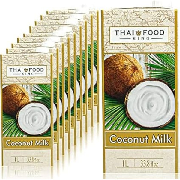 Thai Food King - Pack of 10 Premium Coconut Milk 1 Litre - Original Coconut Milk Creamy Ideal for Cooking, Baking and Desserts - Coconut Milk with High Coconut Content