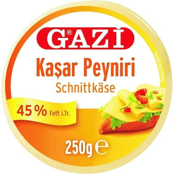Gazi Kashkaval sliced cheese in vacuum packaging made from 100% cow's milk with microbial lab, 45% fat i.tr. In brine, premium quality, vegetarian, Kasar peyniri, for oriental breakfast, as a pizza topping, for baking casseroles As a side dish with bread or salad, consumed pure, when cooking, for gratin, fried or grilled cheese, kashkaval cream, dip, with Börek, with cakes, for oriental breakfast In the Balkans and Turkey, a very often used cut cheese, slightly spicy and strong taste, rounded off by a salt note. Kashkaval is made from cow's milk, spicy, spicy and often slightly salty The Kashkaval cheese is a popular cut cheese used in many countries of Eastern Europe and the Eastern Mediterranean in many dishes. The rind of the Kashkaval cut cheese is smooth and dry Naturally without dyes, preservatives, flavour enhancers, flavours, halal, is generally well tolerated by lactose intolerant people, aged in brine, vacuumed › See more product details; Product description Product description Gazi Kashkaval cut cheese in vacuum 45% fat i.tr. cow cheese mild kasar peyniri As a side dish with bread or salad, consumed pure, when cooking, for gratin, fried or grilled cheese, kashkaval cream, dip, with Börek, with cakes, for oriental breakfast. It is a very popular cut cheese in the Balkans and Turkey, slightly spicy and strong taste, rounded off by a salt note. Kashkaval is made from cow's milk, ideal for baking casseroles or as a pizza topping. Naturally free from dyes, preservatives, flavour enhancers, flavours, vegetarian, gluten-free, halal, with microbial lab, mild Made from 100% cow's milk, premium quality, Kasar peyniri, cow cheese, cheese, is generally well tolerated by lactose intolerant people, vacuum packaging, aged in brine. Ingredients: pasteurized cow's milk table salt microbial lab lactic acid cultures Nominal filling weight: 1250 g. Nutritional values 100 g contain average: Calorific value/energy: 1341kj/320kcal. Fat: 25 g. - Of which saturated fatty acids: 17 g. Carbohydrates: 0.5 g. - Of which sugar: 0.5 g. Protein: 24 g. Salt: 2.5 g Directions As a side dish with bread or salad, consumed pure, when cooking, for gratin, fried or grilled cheese, kashkaval cream, dip, with Börek, with cakes, for oriental breakfast Manufacturer Contact Information Hymor UG, Ickerner Straße 3a, 45731 Waltrop See more; Product description Product description Gazi Kashkaval cut cheese in vacuum 45% fat i.tr. cow cheese mild kasar peyniri As a side dish with bread or salad, consumed pure, when cooking, for gratin, fried or grilled cheese, kashkaval cream, dip, with Börek, with cakes, for oriental breakfast. It is a very popular cut cheese in the Balkans and Turkey, slightly spicy and strong taste, rounded off by a salt note. Kashkaval is made from cow's milk, ideal for baking casseroles or as a pizza topping. Naturally free from dyes, preservatives, flavour enhancers, flavours, vegetarian, gluten-free, halal, with microbial lab, mild Made from 100% cow's milk, premium quality, Kasar peyniri, cow cheese, cheese, is generally well tolerated by lactose intolerant people, vacuum packaging, aged in brine. Ingredients: pasteurized cow's milk table salt microbial lab lactic acid cultures Nominal filling weight: 1250 g. Nutritional values 100 g contain average: Calorific value/energy: 1341kj/320kcal. Fat: 25 g. - Of which saturated fatty acids: 17 g. Carbohydrates: 0.5 g. - Of which sugar: 0.5 g. Protein: 24 g. Salt: 2.5 g Directions As a side dish with bread or salad, consumed pure, when cooking, for gratin, fried or grilled cheese, kashkaval cream, dip, with Börek, with cakes, for oriental breakfast Manufacturer Contact Information Hymor UG, Ickerner Straße 3a, 45731 Waltrop See more; Product description Gazi Kashkaval cut cheese in vacuum 45% fat i.tr. cow cheese mild kasar peyniri As a side dish with bread or salad, consumed pure, when cooking, for gratin, fried or grilled cheese, kashkaval cream, dip, with Börek, with cakes, for oriental breakfast. It is a very popular cut cheese in the Balkans and Turkey, slightly spicy and strong taste, rounded off by a salt note. Kashkaval is made from cow's milk, ideal for baking casseroles or as a pizza topping. Naturally free from dyes, preservatives, flavour enhancers, flavours, vegetarian, gluten-free, halal, with microbial lab, mild Made from 100% cow's milk, premium quality, Kasar peyniri, cow cheese, cheese, is generally well tolerated by lactose intolerant people, vacuum packaging, aged in brine. Ingredients: pasteurized cow's milk table salt microbial lab lactic acid cultures Nominal filling weight: 1250 g. Nutritional values 100 g contain average: Calorific value/energy: 1341kj/320kcal. Fat: 25 g. - Of which saturated fatty acids: 17 g. Carbohydrates: 0.5 g. - Of which sugar: 0.5 g. Protein: 24 g. Salt: 2.5 g Directions As a side dish with bread or salad, consumed pure, when cooking, for gratin, fried or grilled cheese, kashkaval cream, dip, with Börek, with cakes, for oriental breakfast Manufacturer Contact Information Hymor UG, Ickerner Straße 3a, 45731 Waltrop See more