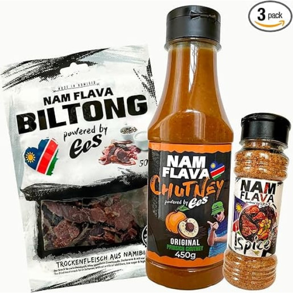 Original Namibia dried meat made from 100% free range. 100 g Biltong is made from approx. 240g beef made High-quality apricots and peaches chutney from southern Africa and contains no MSG (flavour enhancer) Bring the Namibian taste into your food in the typical \