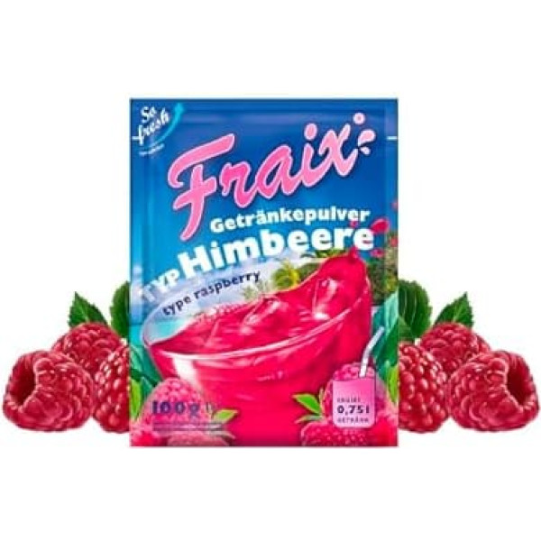 Summer feeling at any time: turn ordinary water into refreshing fruit juice drinks with the delicious Fraix Instant drink powder - a feeling like in summer that you can enjoy all year round No more carrying boxes: no more tedious box towing! With Fraix you can easily transform tap water into delicious drinks and save not only money, but also protect your back. With the tedious box towing Fruit and vitamin C: easy to prepare, enjoy delicious fruit juice drinks in no time at all. Simply place a bag of Fraix beverage powder in a glass, add 750 ml of cold water, stir and enjoy immediately. Perfect for on the go and the whole family: the handy packaging with 50 bags of 100 g makes Fraix ideal for on the go. PERFECT FOR THE WHOLE FAMILY - Kids and adults will love the versatility and taste For all moments: whether travelling, picnics, at work or at children's parties – Fraix Instant drink powder is the ideal choice. Enjoy it on special occasions or simply to create beautiful moments. › See more product details; Product description Product description Instant drink powder for making soft drinks with raspberry flavour and vitamin C. Preparation: add contents of the bag to 750 ml of cold water. Stir and you're done! Storage: Store in a dry place away from heat. Ingredients Sugar, dextrose, acidifier: citric acid; beetroot powder, raspberry juice powder (0.1%), maltodextrin, carrot concentrate, flavour, release agent: calcium phosphates, silicon dioxide; vitamin C. Directions Place the contents of the bag in 750 ml of cold water. Stir and you're done! See more; Product description Product description Instant drink powder for making soft drinks with raspberry flavour and vitamin C. Preparation: add contents of the bag to 750 ml of cold water. Stir and you're done! Storage: Store in a dry place away from heat. Ingredients Sugar, dextrose, acidifier: citric acid; beetroot powder, raspberry juice powder (0.1%), maltodextrin, carrot concentrate, flavour, release agent: calcium phosphates, silicon dioxide; vitamin C. Directions Place the contents of the bag in 750 ml of cold water. Stir and you're done! See more; Product description Instant drink powder for making soft drinks with raspberry flavour and vitamin C. Preparation: add contents of the bag to 750 ml of cold water. Stir and you're done! Storage: Store in a dry place away from heat. Ingredients Sugar, dextrose, acidifier: citric acid; beetroot powder, raspberry juice powder (0.1%), maltodextrin, carrot concentrate, flavour, release agent: calcium phosphates, silicon dioxide; vitamin C. Directions Place the contents of the bag in 750 ml of cold water. Stir and you're done! See more