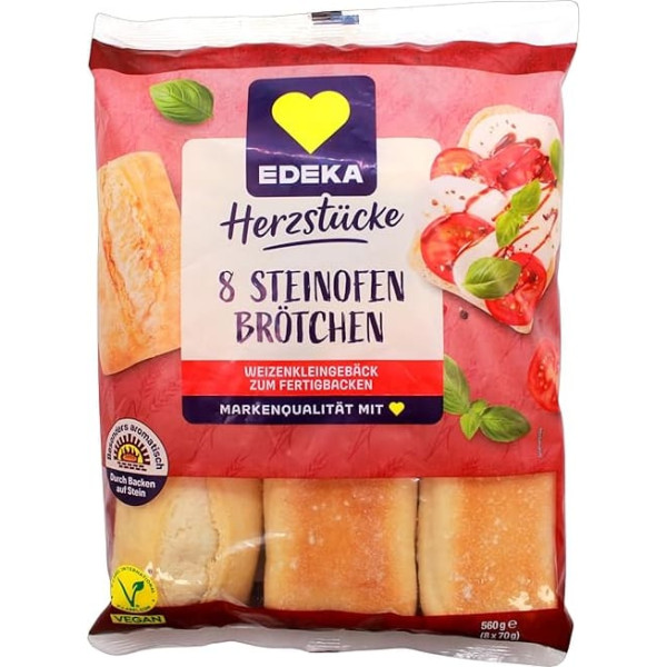 Wheat biscuits for baking Particularly aromatic by baking on stone. Edeka Herzstücke Brand quality with heart Contents per bag 8 rolls of 70 g Box contents: 6 bags of 560 g › See more product details; Product description Wheat pastries for ready baking. Ingredients: wheat flour, water, hard wheat grill, table salt, sunflower oil, yeast, acidity regulator: sodium acetates; wheat malt flour, alcohol. The product may contain traces of soy, milk, mustard and sesame. Average nutritional values per 100 g calorific value in kJ 1003 calorific value in kcal 237 fat in g 1.6 fat, of which saturated fatty acids in g 0.2 carbohydrates in g 46.3 carbohydrates, of which sugar in g 3.7 protein in g 7.6 salt in g 1.2. Packaged under protective atmosphere. Allergens contained: cereals containing gluten and products derived from them, wheat and products derived from them. May contain traces of: soybeans and products thereof; milk and products thereof (including lactose); mustard and products thereof; sesame seeds and products thereof. Oven: remove the stone oven rolls from the packaging, moisten lightly with water and bake in a preheated oven for 8-12 minutes at 200°C (top/bottom heat) or 180°C (convection) on medium rail. Allow to cool briefly before consumption. The mentioned baking time depends on the oven, serves as a guide and can be changed according to taste and desired browning.; Product description Wheat pastries for ready baking. Ingredients: wheat flour, water, hard wheat grill, table salt, sunflower oil, yeast, acidity regulator: sodium acetates; wheat malt flour, alcohol. The product may contain traces of soy, milk, mustard and sesame. Average nutritional values per 100 g calorific value in kJ 1003 calorific value in kcal 237 fat in g 1.6 fat, of which saturated fatty acids in g 0.2 carbohydrates in g 46.3 carbohydrates, of which sugar in g 3.7 protein in g 7.6 salt in g 1.2. Packaged under protective atmosphere. Allergens contained: cereals containing gluten and products derived from them, wheat and products derived from them. May contain traces of: soybeans and products thereof; milk and products thereof (including lactose); mustard and products thereof; sesame seeds and products thereof. Oven: remove the stone oven rolls from the packaging, moisten lightly with water and bake in a preheated oven for 8-12 minutes at 200°C (top/bottom heat) or 180°C (convection) on medium rail. Allow to cool briefly before consumption. The mentioned baking time depends on the oven, serves as a guide and can be changed according to taste and desired browning.; Wheat pastries for ready baking. Ingredients: wheat flour, water, hard wheat grill, table salt, sunflower oil, yeast, acidity regulator: sodium acetates; wheat malt flour, alcohol. The product may contain traces of soy, milk, mustard and sesame. Average nutritional values per 100 g calorific value in kJ 1003 calorific value in kcal 237 fat in g 1.6 fat, of which saturated fatty acids in g 0.2 carbohydrates in g 46.3 carbohydrates, of which sugar in g 3.7 protein in g 7.6 salt in g 1.2. Packaged under protective atmosphere. Allergens contained: cereals containing gluten and products derived from them, wheat and products derived from them. May contain traces of: soybeans and products thereof; milk and products thereof (including lactose); mustard and products thereof; sesame seeds and products thereof. Oven: remove the stone oven rolls from the packaging, moisten lightly with water and bake in a preheated oven for 8-12 minutes at 200°C (top/bottom heat) or 180°C (convection) on medium rail. Allow to cool briefly before consumption. The mentioned baking time depends on the oven, serves as a guide and can be changed according to taste and desired browning.