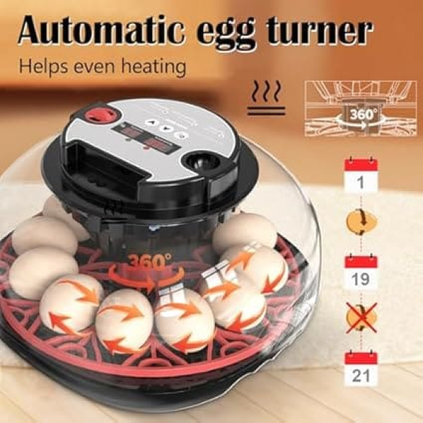 Fully Automatic Incubator for Chickens with Egg Turner, Automatic LED Lighting, Moisture Control and Temperature Monitor for 12 Eggs