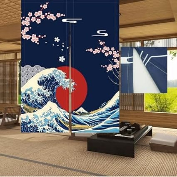 LIGICKY Japanese Style Thick Noren Long Curtains, Double-Sided Print Cherry Blossom and Kanagawa Waves Door Curtain, Room Divider, Tapestry for Home Textiles, Room Divider, 85 x 120 cm, Blue