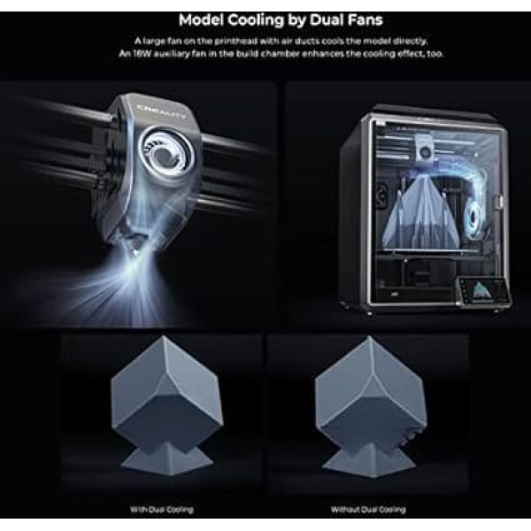 Two fans for model cooling: the fan of the Creality K1 3D printer on the print head with directional air channels coupled with an auxiliary fan in the building chamber cools the model immediately. 12 times faster and more efficient: The Creality K1 3D printer has a maximum speed of 600 mm/s and an acceleration of 20,000 mm/s², making it 12 times faster than a normal FDM 3D printer. With the Max 32³/s Flow Hotend, the new ceramic heater in the hotend encloses the entire nozzle, heats up to 200°C in just 40 seconds and melts the filament immediately. Hands-free automatic levelling: Stretch sensors in the heating bed ensure precise automatic levelling without intervention. The intelligent G-sensor releases ringing for high speed pressure, while accurate Z axis positioning minimizes Z streaking. Remote monitoring and easy extensions: Creality K1 3D printer with WiFi connection, remote control and monitoring of Creality Cloud or Creality Print is effortless. The powerful dual-core 12GHz CPU runs the intelligent Creality operating system and can accommodate an optional AI LiDAR/Al camera (not included). Stable frame and closed chamber: the unibody die-cast frame is CNC milled for maximum stability, and the closed building chamber holds a number of filaments. The printer comes fully assembled and calibrated before shipping, with a quick start guide and a self-test. › See more product details