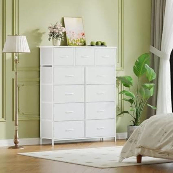 Somdot Chest of Drawers White with 11 Fabric Drawers, Sideboard with Wooden Top, Cabinet for Living Room, Hallway, Dresser Cabinet, Kitchen Cabinet, Wardrobe, Bedroom Cabinet