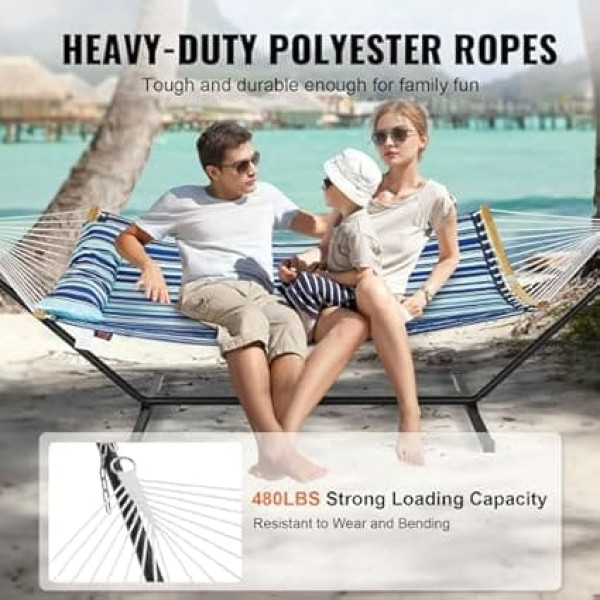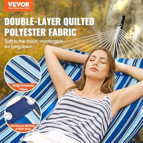 VEVOR Hammock for 2 Person Double Hammock with Curved Spreader Bar Removable Cushion and Portable Carry Bag Outdoor Hammock Load Capacity 200kg Blue White Stripes Quilted