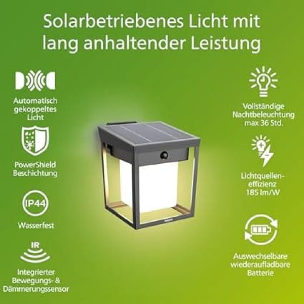 Ultra-efficient, durable solar light – these ultra-efficient solar lights from Philips provide up to 36 hours of light at a time. Enjoy evenly bright light at night, even in cloudy or bad weather. Constant brightness over time – enjoy continuous brightness for hours, so you can illuminate your garden, patio, entrance or other outdoor area with reliable light that lasts up to four nights. High-quality materials for aesthetics and durability: the durable PowerShield coating, developed in collaboration with AkzoNobel, ensures that the colours of the case remain vibrant and do not fade under sunlight. Enjoy a fresh look for years to come! Wireless operation for easy installation and use – our solar lights for outdoor use are powered exclusively by solar energy. No wiring is required, making them easy to install and position anywhere in your garden or other outdoor area. Excellent for reliable outdoor use – designed to function reliably in damp outdoor environments and thoroughly tested to ensure water resistance. IP44 protection means protection against dust and splashes of water - perfect for general outdoor use. According to the EU directive on energy efficiency labelling, this product does not require information on energy efficiency labelling due to its parameters. › See more product details