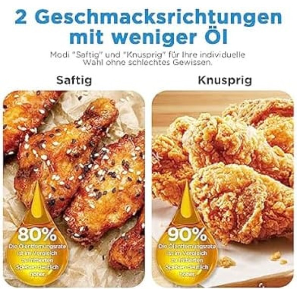 Variety of flavours and energy efficiency: Our innovative JuicyLock technology guarantees deliciously juicy and at the same time delicate food. You have the freedom to choose between two flavours and benefit from double health awareness. Our juicy and crispy modes reduce oil content by 80% and 90% each. With the Midea XXL hot air fryer, you consume 53% less energy and halve the usual cooking time. Large viewing window: without opening the square basket or bending over, you can keep an eye on the cooking status of your food thanks to the bevelled viewing window on the top of the air fryers XXL. At the same time, automatic shut-off and overheating protection ensure your safety. 8 pre-programmed cooking modes: intelligent LED touch display with 7 programs (chicken wings, chicken breast, fish, shrimp, chips, chicken, vegetables). In addition, there is a DIY function that allows you to adjust the temperature from 40°C to 200°C and the time up to 12 hours yourself. 7 L capacity: thanks to the generous capacity of 7 litres and the crispness plate, you can prepare a larger amount of food, enough for a whole family. The XXL hot air fryer offers space for 15 chicken wings or a pizza with a diameter of about 23 cm. Unique design: Instead of pulling out the basket, you can simply press the button, and the lid pops up quickly and then opens slowly. The square basket has frosted handles for easy handling, a special plate to speed up circulation and separation of grease and non-slip feet for safe standing. Easy to clean: Both the frying basket and the plate of the Midea hot air fryer are equipped with a non-stick coating, which means that grease and food residues do not easily stick to the surface and can be easily washed or wiped clean. › See more product details