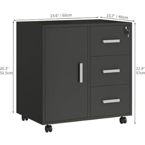 SPECIFICATIONS - Overall dimensions: 60cm L × 40cm W × 57cm H. This filing cabinet has 3 drawers and a door. This design makes it easy to store different sized items. The spacious desk provides space for your printer or scanner. The sturdy construction ensures a total load of up to 150 kg. The drawers provide an ideal storage space for pens, staplers, calculators and other office supplies. High-quality materials: Made of high-quality materials, E1 MDF and chipboard. This filing cabinet is strong, durable and designed for quality. Smooth wheels - The filing cabinet is equipped with 4 360 degree rotating wheels, so you can move it freely to any place without scratching the floor. And the two front casters have built-in brakes that hold the cabinet in place and thus increase stability. Multifunctional use: This filing cabinet has a stylish look and a practical design. You can place it at the end of the computer desk to expand your work area, or hide it under the desk to save space. In addition, it can also be used in the study, bedroom or living room as a bookcase, bedside table, console table, etc. Easy to assemble - The chest of drawers comes with detailed and clear instructions with easy-to-follow images to ensure easy assembly. In addition, the smooth surface is waterproof and easy to keep clean with a damp cloth. This product comes in flat packaging. ​ › See more product details