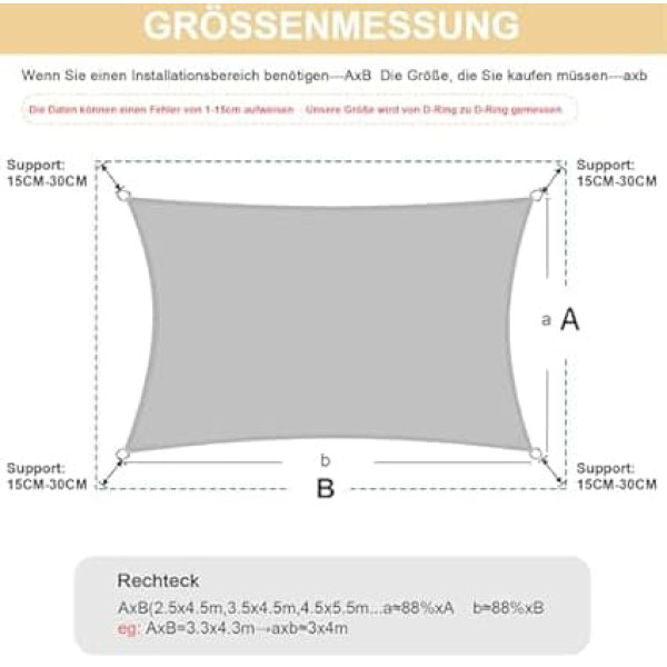 99.9% waterproof: Awnings have a splash-proof coating on the fabric surface and a double PU coating on the inside. The awning consists of two parts of fabric. The seams of the fabric are treated with hot press adhesive, which prevents water from entering through the seams. Water pressure resistance: 400 mm HH -600 mm HH. High quality: The awning is made of 160 g/m² polyester fabric. It has the properties of high tensile strength. Ageing resistance, corrosion resistance and radiation resistance. Strong seams and durable D-rings made of 304 stainless steel on each corner. It blocks 98% of UV rays. Practical and aesthetic design: Curved design shows artistic beauty, stretches the sun canvas better to avoid wrinkles and sagging. All edges are reinforced with double seams to prevent fraying and deformation of the edges. Due to the curved sides, the actual shaded area is slightly reduced. Various colours and sizes are available. Easy to install: Measured from D-ring to D-ring. Leave a distance of 30-45 cm between the attachment point and the canvas to attach fittings / hooks / ropes. (Fixed kits are sold separately, not included.) Waterproof awnings must be installed at an angle of 20-40 degrees with maximum voltage so that the water can drain away. Applications: Widely used for garden, terrace, yard, backyard, porch, barbecue, driveway, entrance area, lawn, plant shade, terrace, park, pool, carport, gazebos, camping, pond, or other outdoor occasions. Make your patio safe, cool and fabulous. Please read the product page for size selection carefully. › See more product details