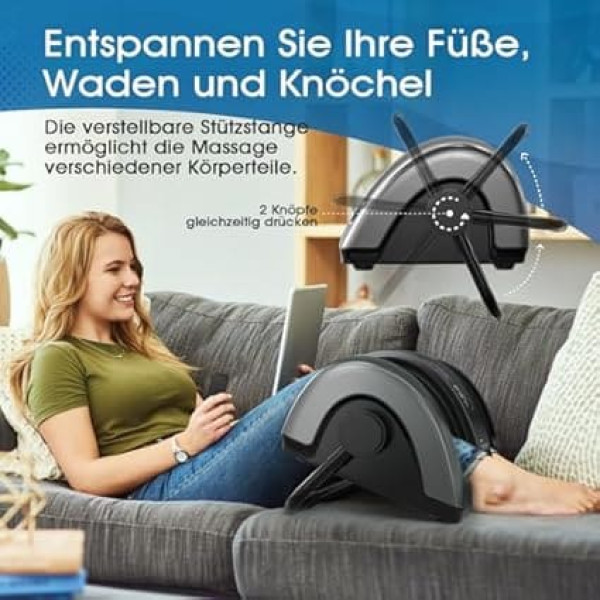 Professional shiatsu massage: TISSCARE foot massager is equipped with 4 bio-adaptive hands, 10 massage rollers and 96 knots and simulates the professional massage techniques of a real masseur. 3 speed settings and 4 modes adapt to every need - whether after sports, long standing or plantar fasciitis. [Multipurpose Massager & Adjustable Support Bar] This innovative open foot massager with 360° adjustable support bar allows massage for your feet, ankles, calves, legs and arms. You can also easily take this foot massager anywhere you want to enjoy a massage. Comfortable heating function: foot massager has the adjustable heating (40-52 °C) loosens tight muscles, promotes blood circulation and relieves inflammation - ideal for plantar fasciitis or cold feet. Thanks to safety overheating protection, you can enjoy the heat without hesitation. Comfortable and hygienic: This leg massager comes with a remote control that allows you to easily operate it without having to bend over. The compact design of the massager makes it easy to store. The breathable foot pads can be easily removed with zips, which are easy to clean and ensures hygienic Shiatsu foot massage. Great gift and service: TISSCARE comprehensive and practical foot massagers are a great holiday and birthday gift, improve the well-being of your friends and family. Luxury PU leather and breathable fabric make the foot massager durable, easy to clean and maintain. Perfect gift for your loved ones (men/women/mom/dad). If you have any questions about the massager, please contact us immediately via Amazon. › See more product details