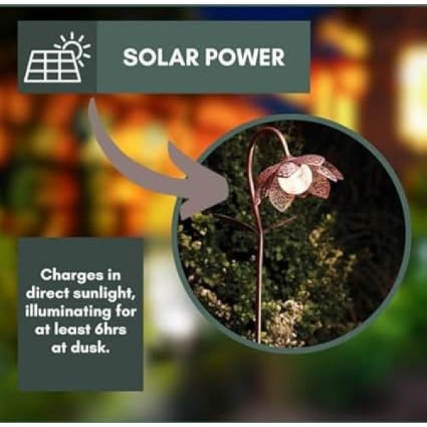 GARDEN STAKES - Standing 90cm tall, these blooming flower solar garden lights look great in any outdoor space. Made from a durable, weather and rust resistant metal, our outdoor solar lights are built to last. DURABLE GARDEN SOLAR LIGHTS - Made from strong steel and finished with a weather resistant powder coating. These garden accessories are able to withstand any weather all year round. UNIQUE SOLAR LIGHTS FOR GARDEN - Our solar powered garden lights feature a unique damask pattern on the petals that casts a shadow of the pattern. The vintage bronze color will also stand out in any outdoor space. Dusk to Dawn Sensor - These solar garden lights feature a built in daylight sensor, which ensures that the garden lights are charged during the day and then automatically light up at night. Versatile LED Garden Lights - With a long stem on a ground stake, these warm white solar lights can be placed in a variety of places. Each garden light is extremely easy to move. › See more product details; Product description GARDEN STAKES - Standing 90cm tall, these blooming flower solar garden lights look great in any outdoor space. Made from a durable, weather and rust resistant metal, our outdoor solar lights are built to last. Solar Powered Waterproof Garden Lights - Made from strong steel and finished with a weatherproof powder coating. These outdoor garden solar lights are able to withstand any weather and all year round. UNIQUE OUTDOOR SOLAR LIGHTS - Our outdoor solar lights for garden feature a unique damask pattern on the petals that casts a shadow of the pattern. The vintage bronze color will also stand out in any outdoor space. Dusk to Dawn Sensor - These solar garden lights feature a built in daylight sensor, which ensures that the garden lights are charged during the day and then automatically light up at night. Versatile Solar Lights for Garden - With a long stem on a ground stake, these outdoor solar lights can be placed in a variety of places. Each garden light is extremely easy to move.; Product description GARDEN STAKES - Standing 90cm tall, these blooming flower solar garden lights look great in any outdoor space. Made from a durable, weather and rust resistant metal, our outdoor solar lights are built to last. Solar Powered Waterproof Garden Lights - Made from strong steel and finished with a weatherproof powder coating. These outdoor garden solar lights are able to withstand any weather and all year round. UNIQUE OUTDOOR SOLAR LIGHTS - Our outdoor solar lights for garden feature a unique damask pattern on the petals that casts a shadow of the pattern. The vintage bronze color will also stand out in any outdoor space. Dusk to Dawn Sensor - These solar garden lights feature a built in daylight sensor, which ensures that the garden lights are charged during the day and then automatically light up at night. Versatile Solar Lights for Garden - With a long stem on a ground stake, these outdoor solar lights can be placed in a variety of places. Each garden light is extremely easy to move.; GARDEN STAKES - Standing 90cm tall, these blooming flower solar garden lights look great in any outdoor space. Made from a durable, weather and rust resistant metal, our outdoor solar lights are built to last. Solar Powered Waterproof Garden Lights - Made from strong steel and finished with a weatherproof powder coating. These outdoor garden solar lights are able to withstand any weather and all year round. UNIQUE OUTDOOR SOLAR LIGHTS - Our outdoor solar lights for garden feature a unique damask pattern on the petals that casts a shadow of the pattern. The vintage bronze color will also stand out in any outdoor space. Dusk to Dawn Sensor - These solar garden lights feature a built in daylight sensor, which ensures that the garden lights are charged during the day and then automatically light up at night. Versatile Solar Lights for Garden - With a long stem on a ground stake, these outdoor solar lights can be placed in a variety of places. Each garden light is extremely easy to move.
