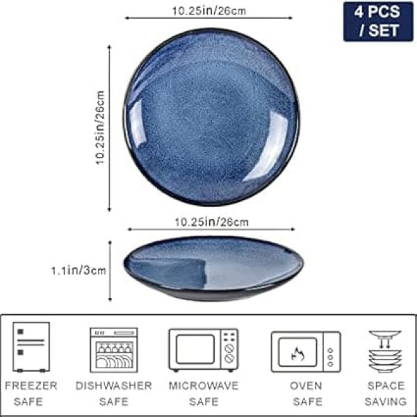 UNICASA Porcelain Plate Set, 26 cm Salad Plates, Vintage Blue, Dinner Plate Set, 4-Piece Crockery Service Dinner Service