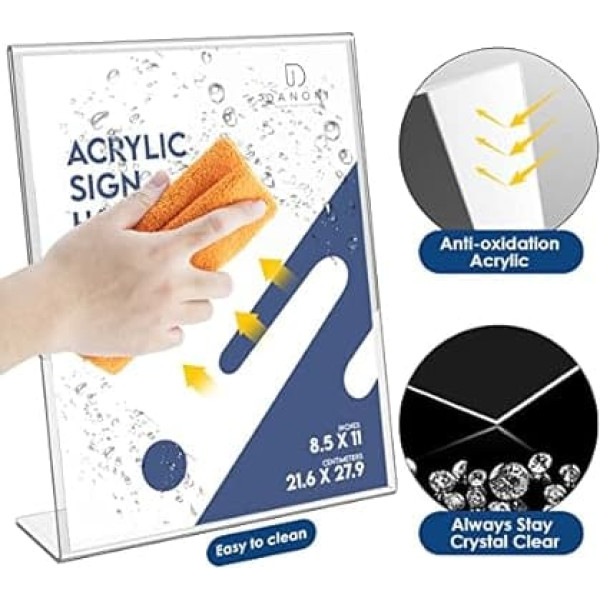 STURDY:This product is made of 2mm thick transparent acrylic plate, which is not deformed, not fragile and very durable. The stand can display posters or pictures clearly 【High Quality Acrylic】Transparent acrylic sign holders are made of high quality acrylic synthesized at once, with high strength and high transparency. It will not darken under strong light or sun and has good stability 【Oblique Design】This plastic paper stand has a slanted back design, the bottom of the stand is sturdy and the desk symbol stand is easy to stand and stand vertically, making it an ideal choice for office pictures, announcements or brochures Widely used: the package contains 6 packs of 8.5 x 11 inch acrylic sign holders. It is very convenient to assemble and can be used to display advertisements, flyers, brochures etc. Suitable for home, offices, schools, restaurants, churches, hotels, exhibitions, receptions, weddings, etc. International products have separate terms, are sold from abroad and may differ from local products, including fit, age ratings, and language of product, labeling or instructions. › See more product details; Product description 1; Product description 1; 1