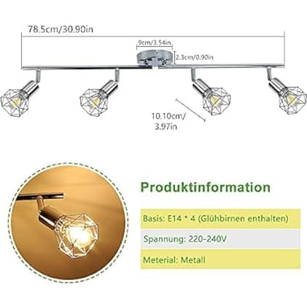 Vintage design: stainless steel ceiling light made of high-quality chrome, chrome colour and wire basket. The soft light can be penetrated through any hole. Very pretty. With metal body, it is durable and has 30,000 hours service life. ⭐【4-LED bulbs including The packaging contains four 4 W E14 LED bulbs. 1280 total lumen light output. Brighter than a 60 W incandescent lamp. 3000 K warm white. CRI 85+. Create a more accurate colour rendering of the objects. Swivel and rotatable: there are 2 adjustable rods with 4 swivelling lamp heads. By adjusting the lamps, the lamp brightens up all directions. The arm can rotate 350°, each head can rotate 330°, and 90° up and down. Wide applications: perfect for art walls, it increases a bit of simple ambient lighting. The ceiling light offers some pleasant atmosphere when switched off. Ideal for bedroom, living room, kitchen, hallway, office. Easy to install: all mounting parts and a canopy mounting plate are prepared for quick and easy installation. The ceiling light can be installed on an inclined or curved ceiling. › See more product details
