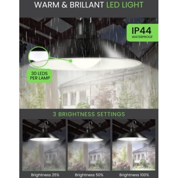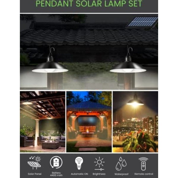 Set of 2 hanging lamps: set of 2 black pendant lamps + 1 solar panel with separate design for better placement. The lights and panel are connected with a 3 metre long cable (included) and are ideal for simultaneous lighting of indoor and outdoor areas such as rooms, patios, patios, portals, gardens. LED lighting: the lamps emit a great brightness in a warm white tone of 3500K, with an intensity of 800 lumens, 400 lumens and 30 LEDs per lamp will illuminate all your rooms very efficiently. The lighting angle is 120º. Solar energy: our solar panel with built-in battery is able to store all the necessary energy during the day to power the two lamps so that they light up all night. Thanks to the highly efficient 5.5V photovoltaic module, a high conversion of light into energy is achieved, which charges the 4400mAh battery. Without connecting to the mains, illuminate your home without increasing your electricity bill. Robust IP44: made of corrosion and weather resistant ABS plastic. With a resistance class of IP44, the solar lights for outdoor use can withstand all weather conditions. You don't have to worry about rain and bad weather. Smart sensor: press the button on the back and the solar panel turns on automatically. In this way, the intelligent sensor only turns on the lamps when it detects darkness. A remote control is included to turn on/off the lighting, set a 3, 5 or 8 hour timer, and change the light intensity to 25%, 50% or 100% brightness. › See more product details