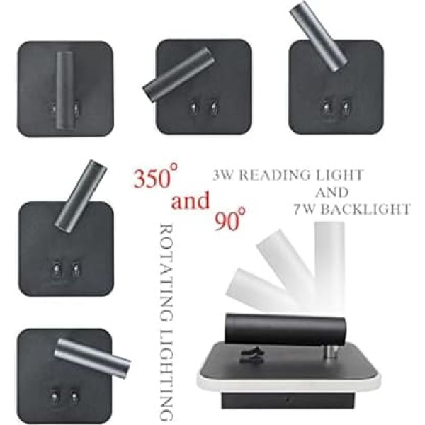 uksunvi LED Wall Light, Bedside Reading Wall Light, 12 W LED Wall Reading Lamps, Adjustable Spotlight (3 W + 9 W 3000 K Warm Light) Black (Black Square 2 Pieces)