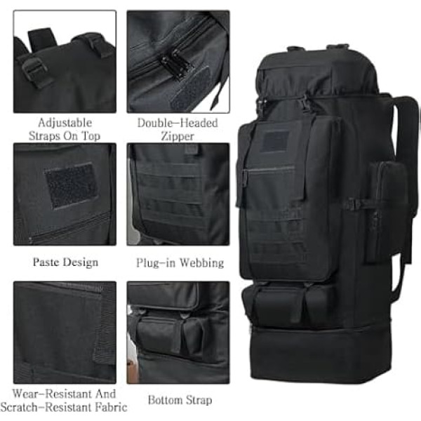 Military Backpack High Quality Material The camping military backpack is made of 600D Oxford cloth and water resistant material, abrasion resistant, tear resistant, scratch resistant. This 100L tactical military backpack with strong suspension system for more items. LARGE CAPACITY CAMPING BACKPACK 100L hiking backpack, large capacity main compartment + 4 large external hangers. The main hiking bag can hold clothes, quilts, travel items and sleeping bags. The camping backpack 100 l offers space for 2-3 people travel equipment. Four external hanging systems can be used for tying tents, moisture-proof mats + trekking poles + tying sleeping mats, picnic mats, etc. Comfortable & Breathable Climbing Backpack:The backpack 100L padded back filled with soft mesh material and the 2cm thick honeycomb foam, and this molle hiking backpack adopts the three-dimensional breathable 3D backpack system, relieves the back and sweats less on the back. Ergonomically padded, widened and thickened S shoulder straps and highly elastic breathable back support for best ventilation and relief. MOLLE BACKPACK MEN: Military backpack bag external molle system for attaching other hiking gear or tactical backpacks. As an assault pack backpack, trekking backpack, backpack backpack, mountaineering backpack, camping backpack bag, hunting backpack and travel backpack for outdoor enthusiasts. Travel backpack size: the hiking backpack men's size is 15.7 x 11.8 x 35.43 inches (40 x 30 x 90 cm), this hiking backpack weighs only 3.74 lb / 1.7 kg for easy carrying and does not burden your trip. It is suitable for camping, hiking, hunting, camping, climbing. We are convinced of our product. If you have any questions or doubts about our hiking backpacks, you can contact us at any time. We will reply to you within 24 hours. › See more product details; Product description Lizbin Wanderrucksack 100L eignet sich perfekt für Reisen, Wandern, Camping, Klettern und andere Outdoor-Aktivitäten, als Geschenk zum Geburtstag und Vatertag.Eigenschaften des Molle-Systemrucksacks:100L WANDERTASCHE: Externes Erweiterungsdesign, einstellbar mehr Kapazität.MILITÄRISCHER WANDERRUCKSACK: Wissenschaftliches Gürtelstrukturdesign, passend zum weichen und breiten Hüftgurt, um mehr Stress vom taktischen Wanderrucksack abzuleiten, Schulter und Rücken zu schützen und sich wohler zu fühlen, wenn Sie viele, viele Sachen tragen.WANDERN CAMPING RUCKSACK: Große Kapazität, 100L Reiserucksack, Zwei-Wege-Reißverschluss-Design.OUTDOOR-RUCKSACK RUCKSACK: Seitentaschen-Design, Gegenstände, die in den Kesselschirm gelegt werden können; Top-Taschen-Design, kann in die Brieftasche und andere Gegenstände gesteckt werden.Tipp:Packen Sie Ihren Molle-Reiserucksack fest durch Kordelzug und Gürtelschnalle, Sie werden sich leicht fühlen, wenn Sie schwere Sachen zurückhaben.Beim Gehen und Wandern nach vorne geneigt, um das Gewicht auf der Schulter zu verteilen.Wenn Sie Fragen zu unseren militärischen taktischen Rucksacktaschen haben, können Sie uns gerne per E-Mail kontaktieren. Wir sind sehr glücklich, sie zu bedienen und wünschen ihnen ein glückliches einkaufen.; Product description Lizbin Wanderrucksack 100L eignet sich perfekt für Reisen, Wandern, Camping, Klettern und andere Outdoor-Aktivitäten, als Geschenk zum Geburtstag und Vatertag.Eigenschaften des Molle-Systemrucksacks:100L WANDERTASCHE: Externes Erweiterungsdesign, einstellbar mehr Kapazität.MILITÄRISCHER WANDERRUCKSACK: Wissenschaftliches Gürtelstrukturdesign, passend zum weichen und breiten Hüftgurt, um mehr Stress vom taktischen Wanderrucksack abzuleiten, Schulter und Rücken zu schützen und sich wohler zu fühlen, wenn Sie viele, viele Sachen tragen.WANDERN CAMPING RUCKSACK: Große Kapazität, 100L Reiserucksack, Zwei-Wege-Reißverschluss-Design.OUTDOOR-RUCKSACK RUCKSACK: Seitentaschen-Design, Gegenstände, die in den Kesselschirm gelegt werden können; Top-Taschen-Design, kann in die Brieftasche und andere Gegenstände gesteckt werden.Tipp:Packen Sie Ihren Molle-Reiserucksack fest durch Kordelzug und Gürtelschnalle, Sie werden sich leicht fühlen, wenn Sie schwere Sachen zurückhaben.Beim Gehen und Wandern nach vorne geneigt, um das Gewicht auf der Schulter zu verteilen.Wenn Sie Fragen zu unseren militärischen taktischen Rucksacktaschen haben, können Sie uns gerne per E-Mail kontaktieren. Wir sind sehr glücklich, sie zu bedienen und wünschen ihnen ein glückliches einkaufen.; Lizbin Wanderrucksack 100L eignet sich perfekt für Reisen, Wandern, Camping, Klettern und andere Outdoor-Aktivitäten, als Geschenk zum Geburtstag und Vatertag.Eigenschaften des Molle-Systemrucksacks:100L WANDERTASCHE: Externes Erweiterungsdesign, einstellbar mehr Kapazität.MILITÄRISCHER WANDERRUCKSACK: Wissenschaftliches Gürtelstrukturdesign, passend zum weichen und breiten Hüftgurt, um mehr Stress vom taktischen Wanderrucksack abzuleiten, Schulter und Rücken zu schützen und sich wohler zu fühlen, wenn Sie viele, viele Sachen tragen.WANDERN CAMPING RUCKSACK: Große Kapazität, 100L Reiserucksack, Zwei-Wege-Reißverschluss-Design.OUTDOOR-RUCKSACK RUCKSACK: Seitentaschen-Design, Gegenstände, die in den Kesselschirm gelegt werden können; Top-Taschen-Design, kann in die Brieftasche und andere Gegenstände gesteckt werden.Tipp:Packen Sie Ihren Molle-Reiserucksack fest durch Kordelzug und Gürtelschnalle, Sie werden sich leicht fühlen, wenn Sie schwere Sachen zurückhaben.Beim Gehen und Wandern nach vorne geneigt, um das Gewicht auf der Schulter zu verteilen.Wenn Sie Fragen zu unseren militärischen taktischen Rucksacktaschen haben, können Sie uns gerne per E-Mail kontaktieren. Wir sind sehr glücklich, sie zu bedienen und wünschen ihnen ein glückliches einkaufen.
