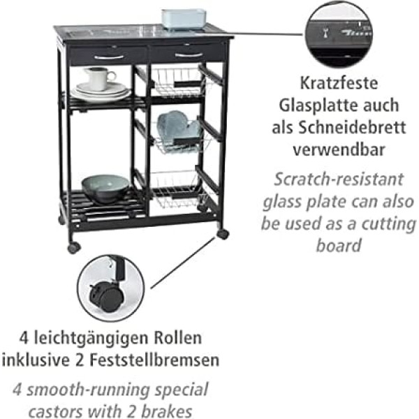 Plenty of storage space: the beautiful kitchen trolley with 2 shelves, 3 baskets and 2 drawers provides plenty of space for kitchen utensils, dishes or spices and brings extra storage space to the kitchen Integrated chopping board: a glass plate with a modern, subtle motif is embedded on the top of the shelf, the plate is scratch-resistant and is ideal as a chopping board for preparing food Multi-purpose: the trolley is not only ideal as a kitchen cabinet, but also can be used as a shelf in the dining room or living room or as a serving trolley at the party High quality material: the kitchen shelf is made of attractive MDF, sturdy and easy to assemble, the trendy black fits perfectly with the modern decor Box contents: Bon Appetit kitchen trolley with 4 wheels and 2 parking brakes, with integrated glass top, including mounting material, made of MDF, dimensions (W x H x D): 67 x 86.5 x 35 cm › See more product details